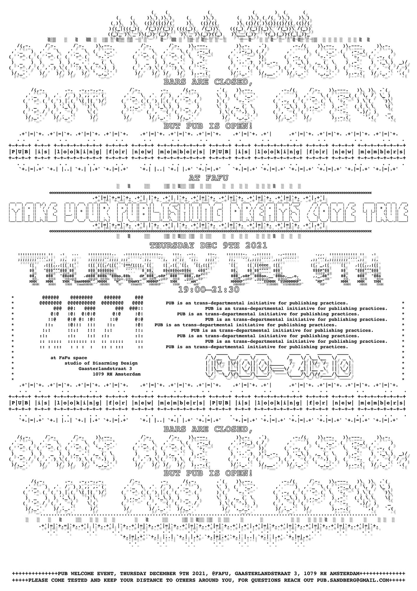 A poster that shouts; BARS ARE CLOSED, BUT PUB IS OPEN, have a drink with us and make your publishing dreams come true. PUB is looking for new members. Designed in collaboration with TextEdit.