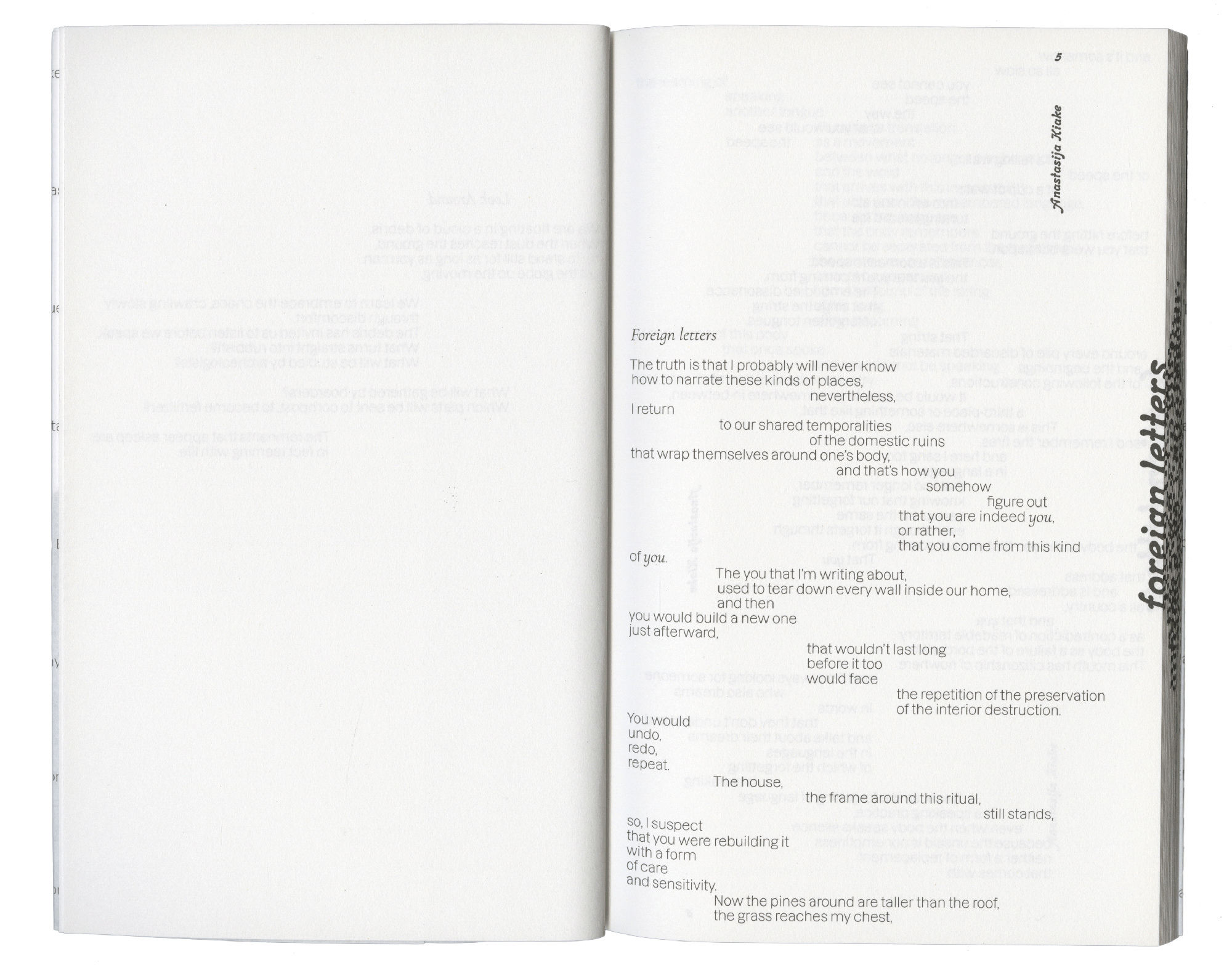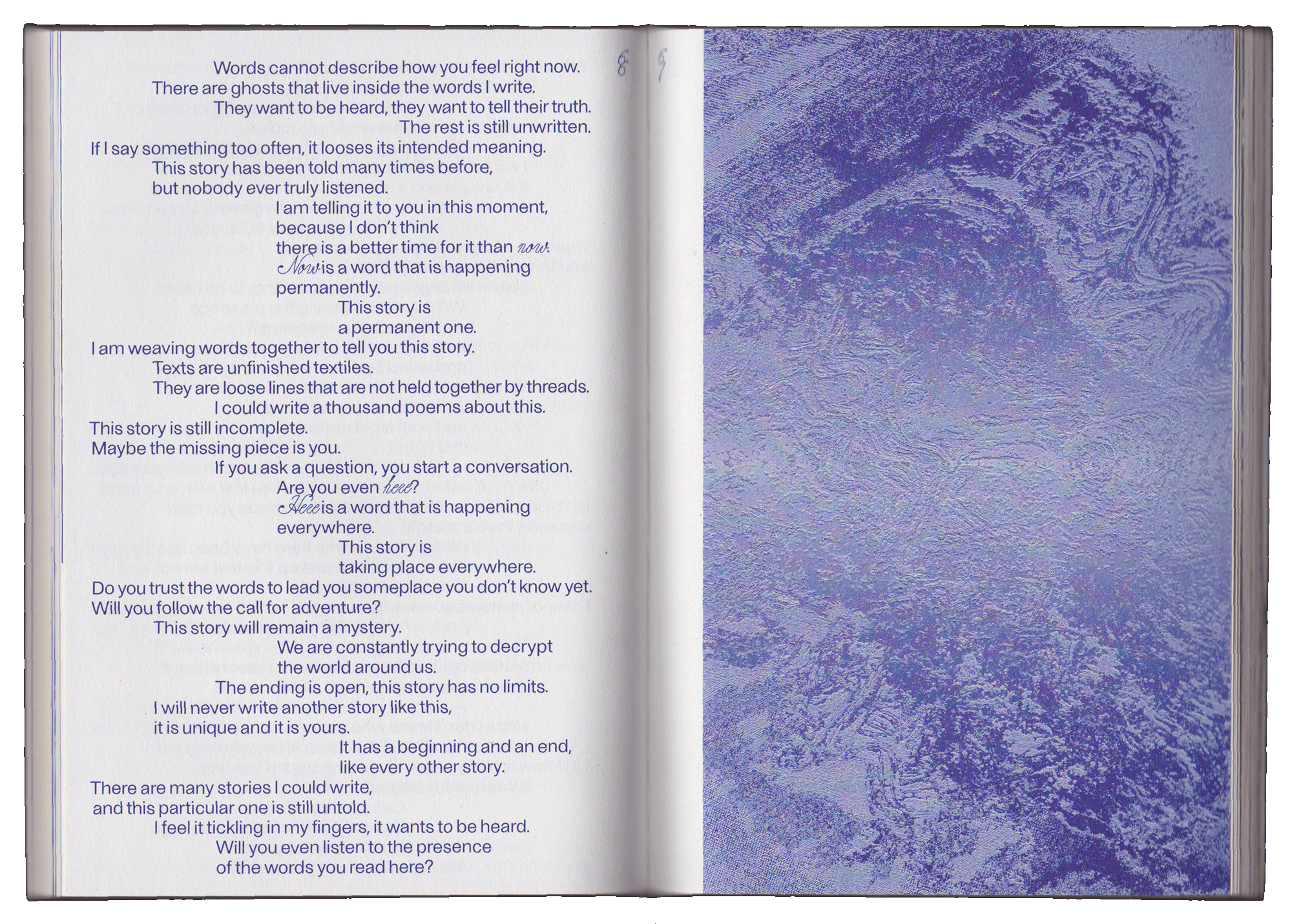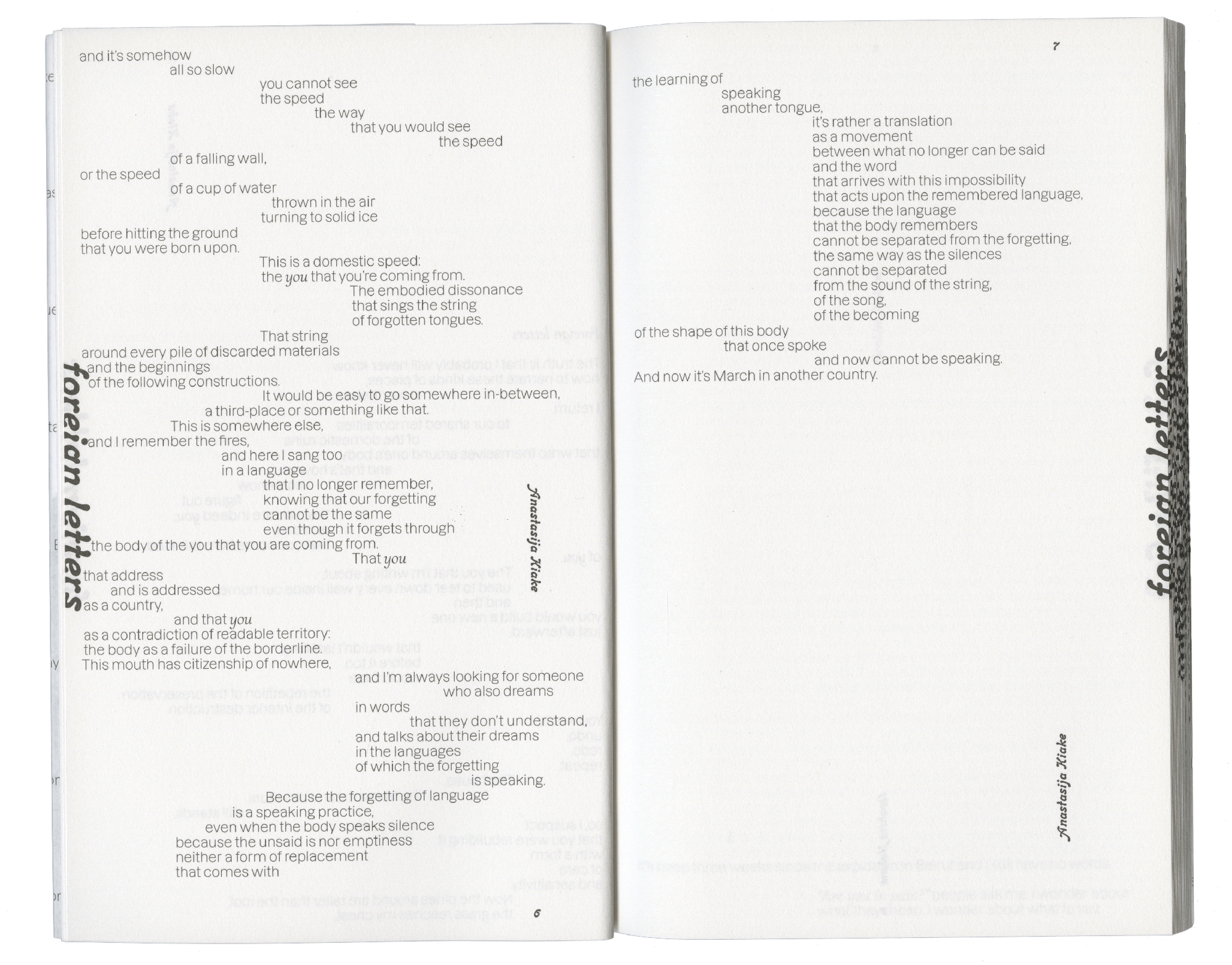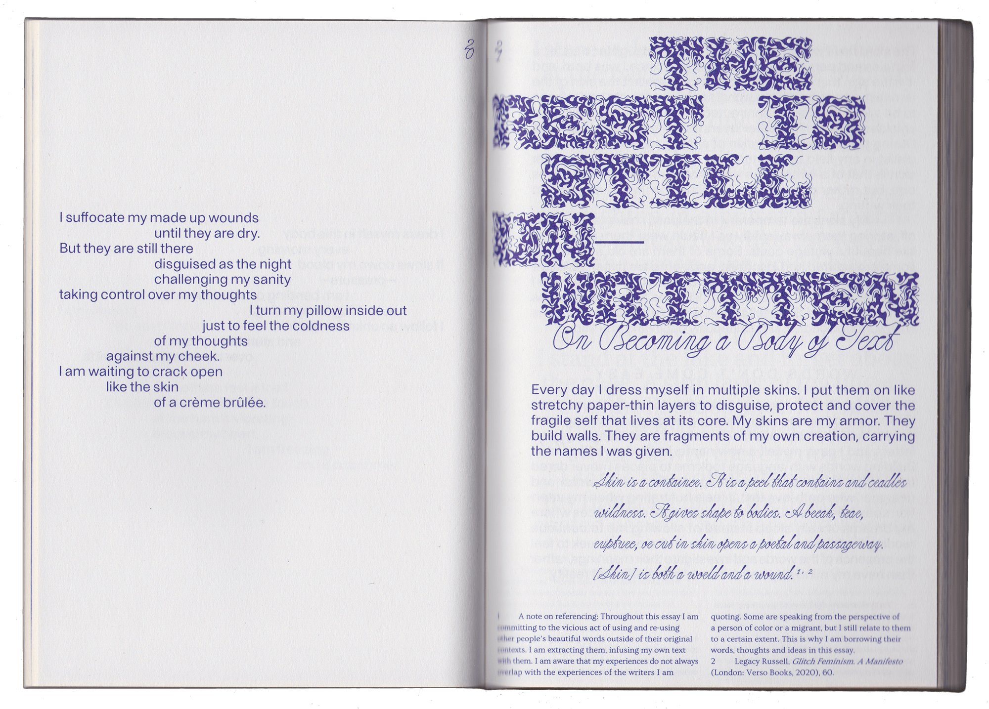 All the words that are written here, have been used before. Two reverse soft covers holding poetry, short texts, a script and the essay The Rest Is Still Unwritten; On Becoming A Body Of Text, which uses skin as a metaphor for questioning the relationship between the meaning and expression, body and text. It reveals the author’s obsession with text and typographic details, while investigating the space between the words and their complicity to the creation of meaning in language.