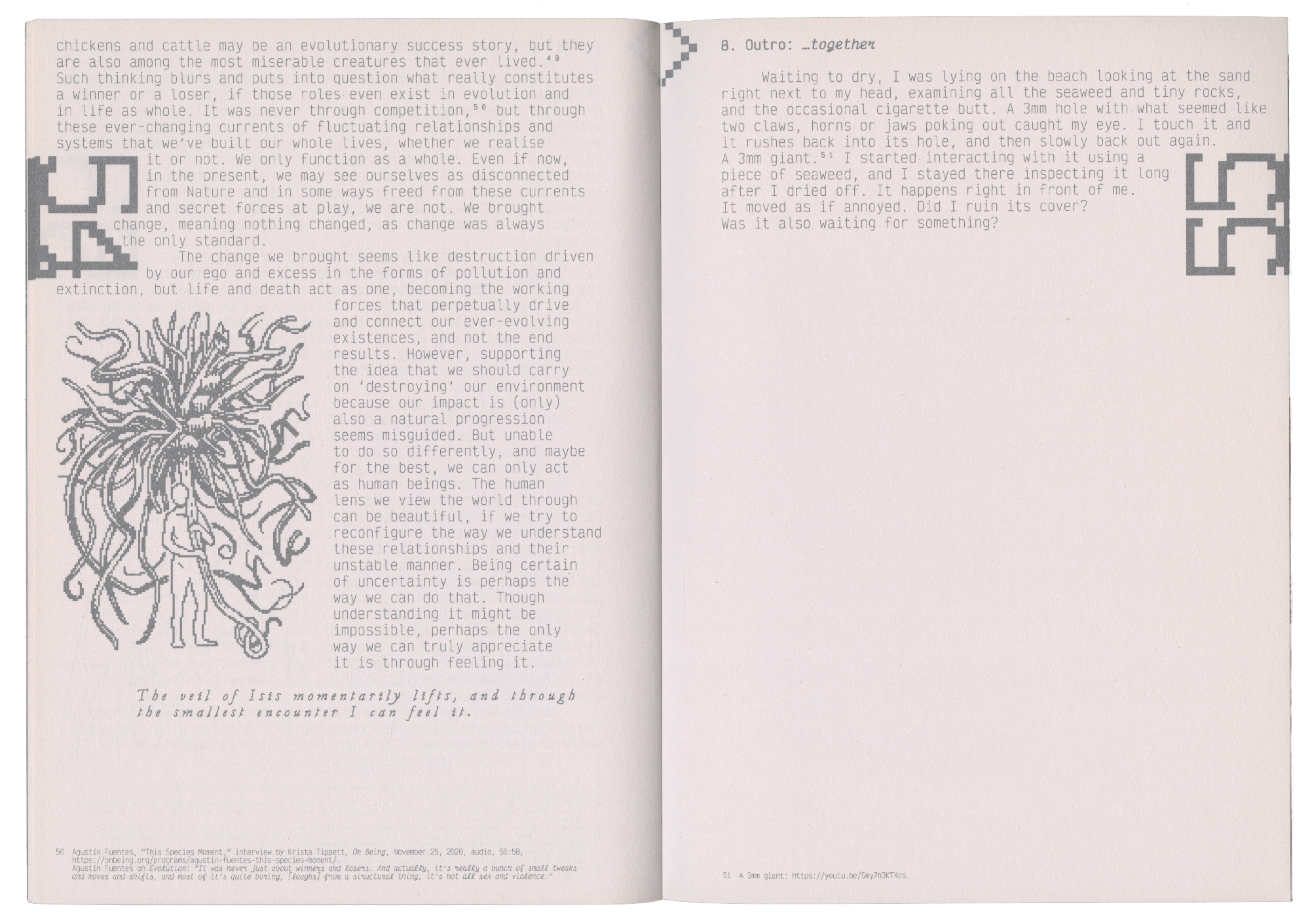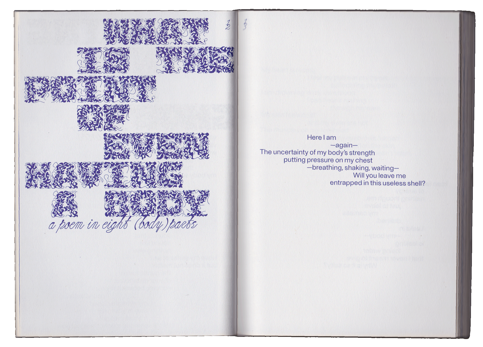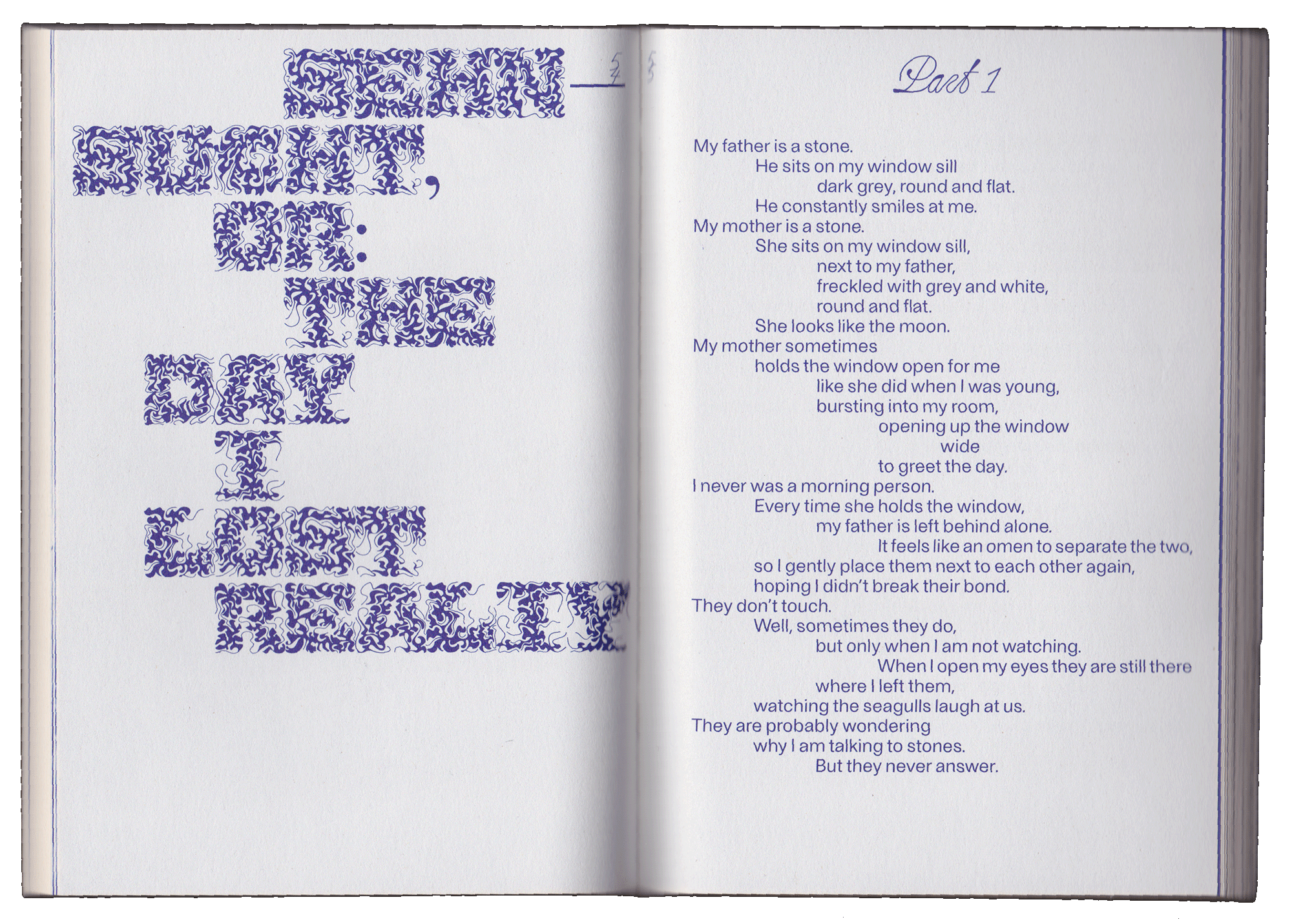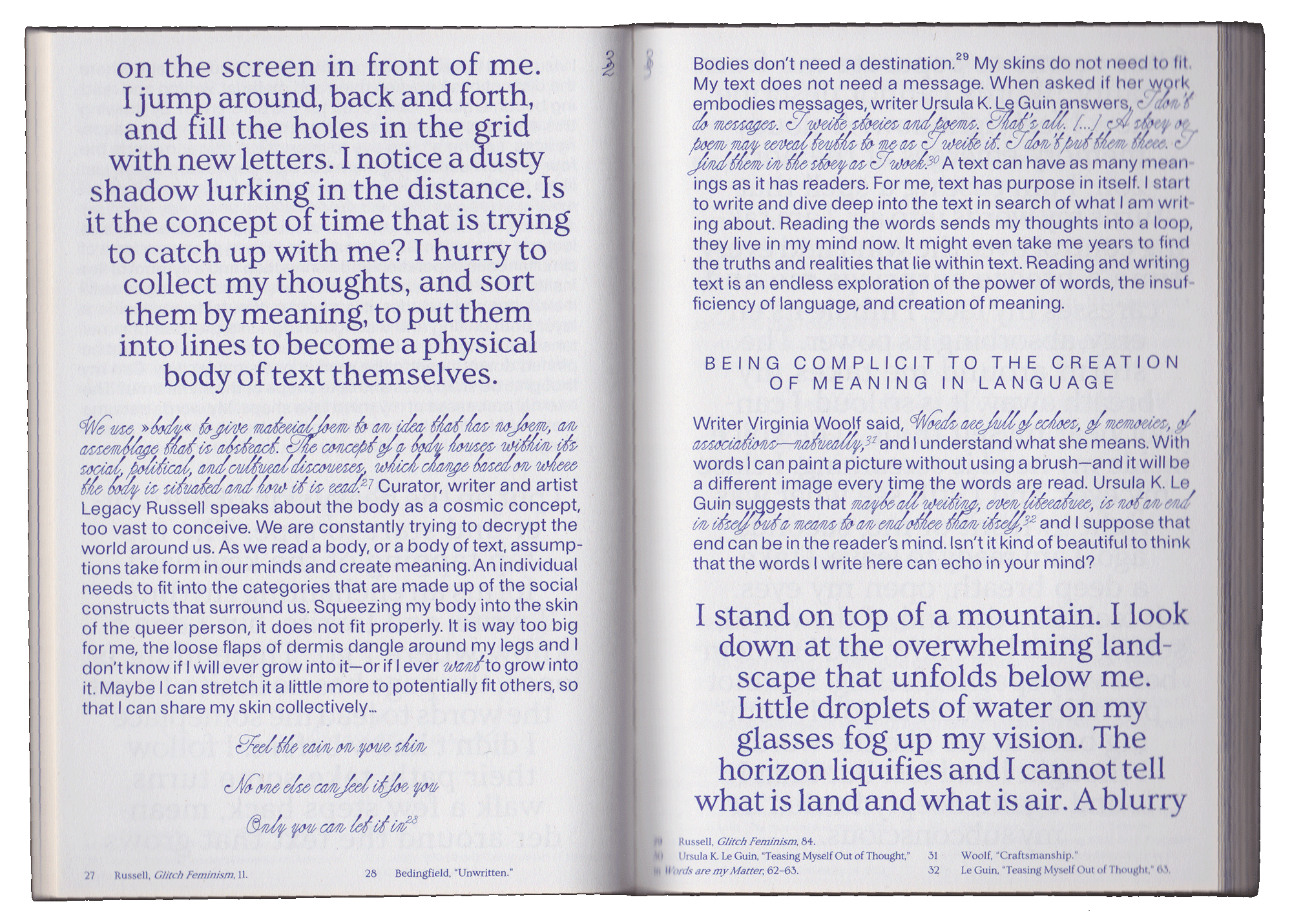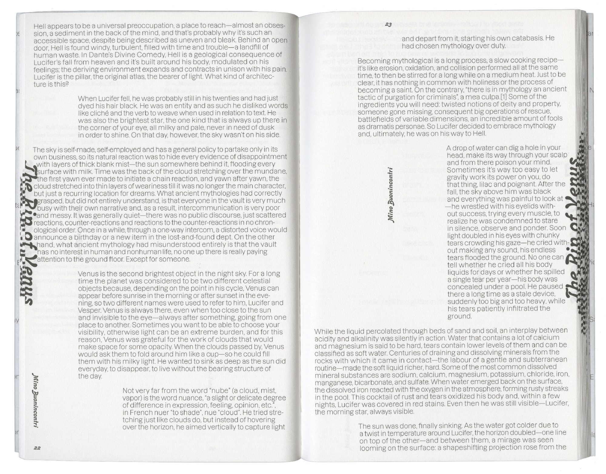 All the words that are written here, have been used before. Two reverse soft covers holding poetry, short texts, a script and the essay The Rest Is Still Unwritten; On Becoming A Body Of Text, which uses skin as a metaphor for questioning the relationship between the meaning and expression, body and text. It reveals the author’s obsession with text and typographic details, while investigating the space between the words and their complicity to the creation of meaning in language.