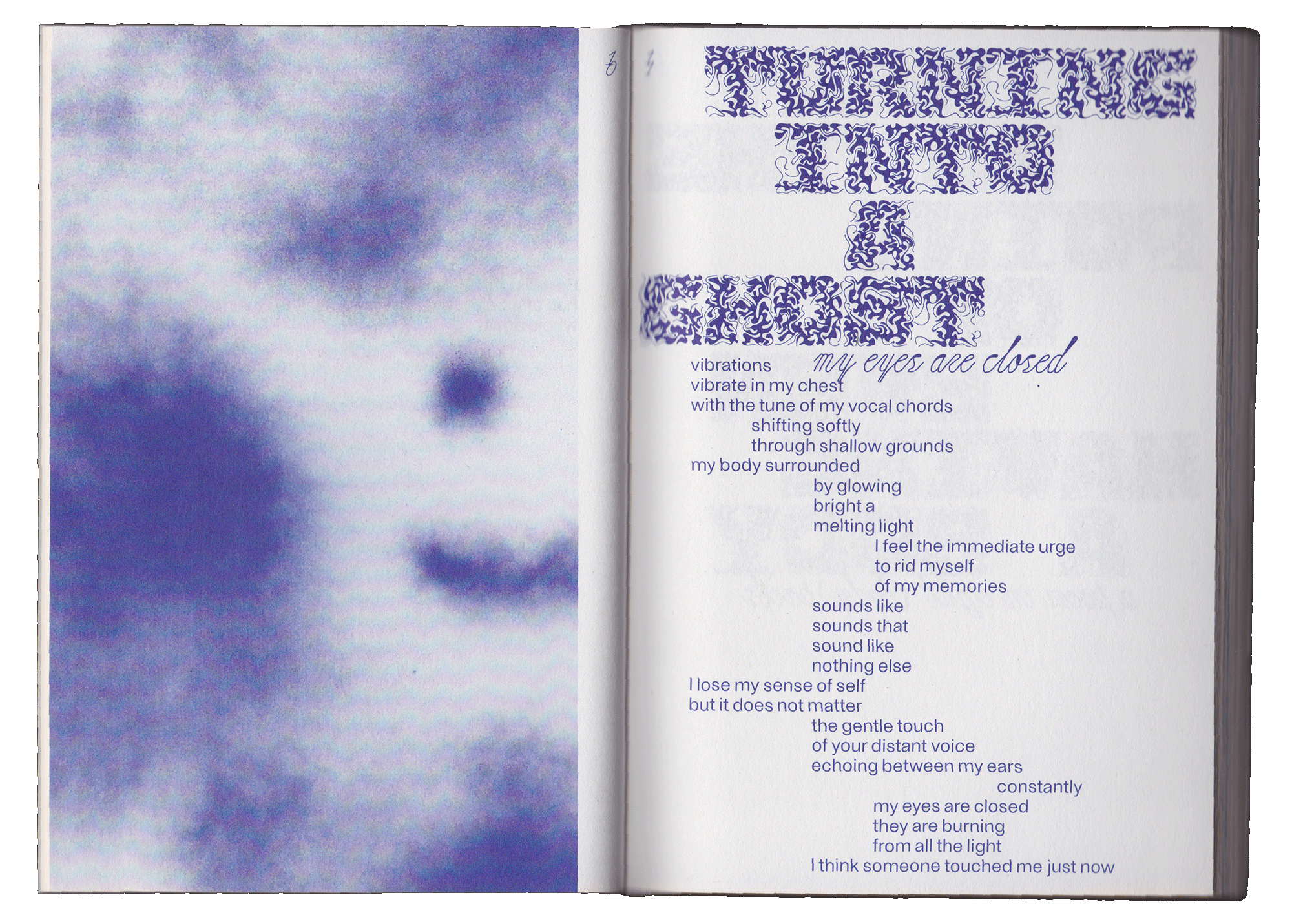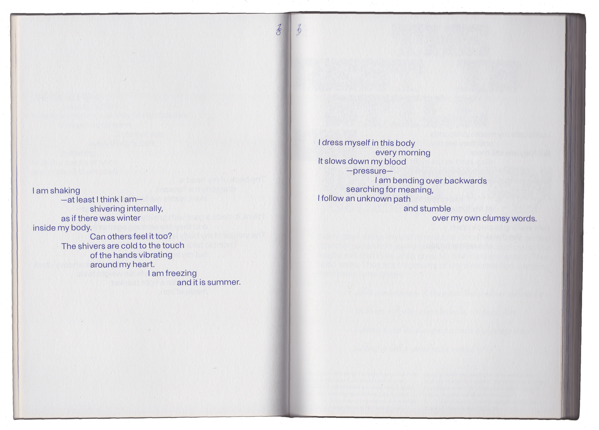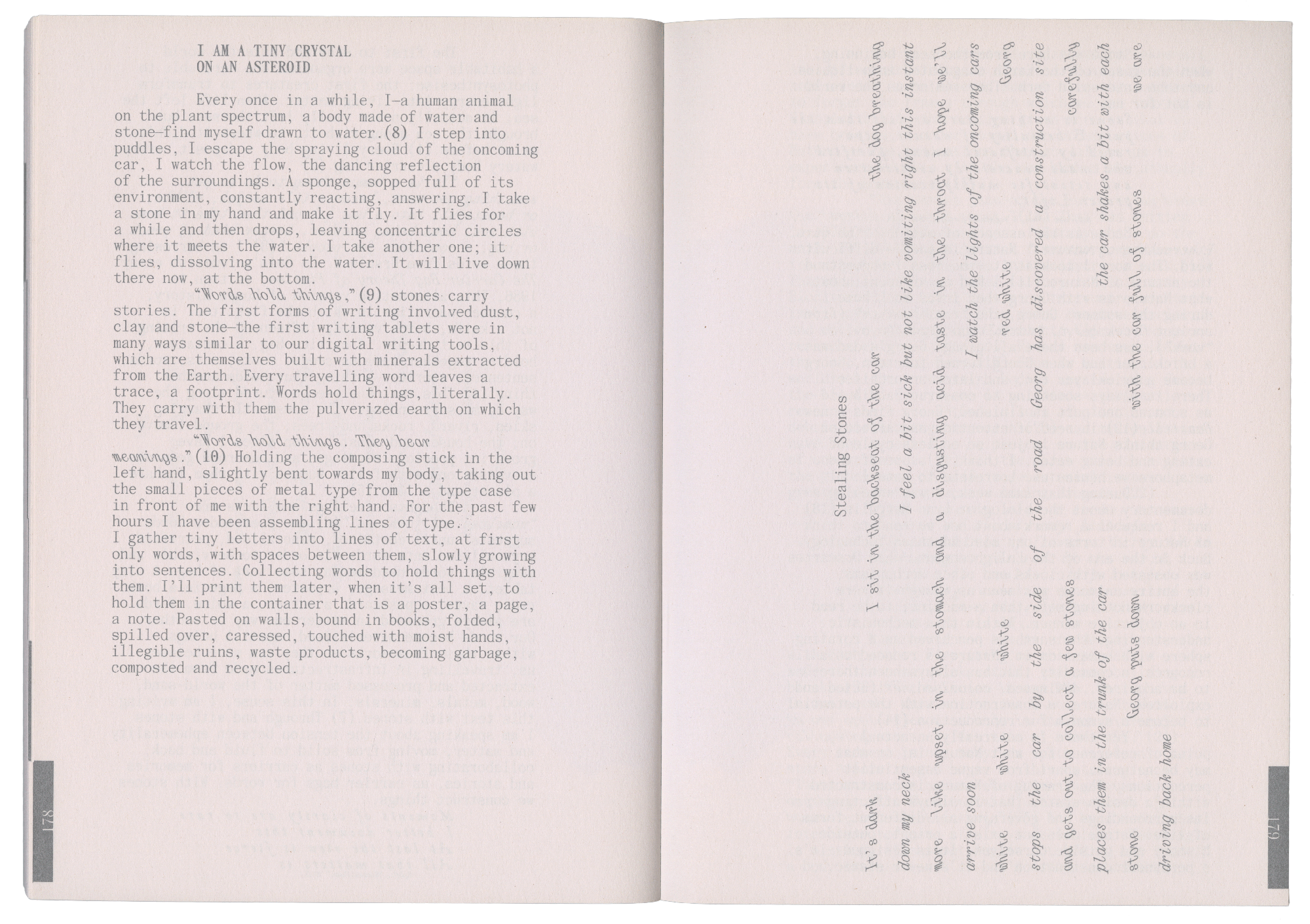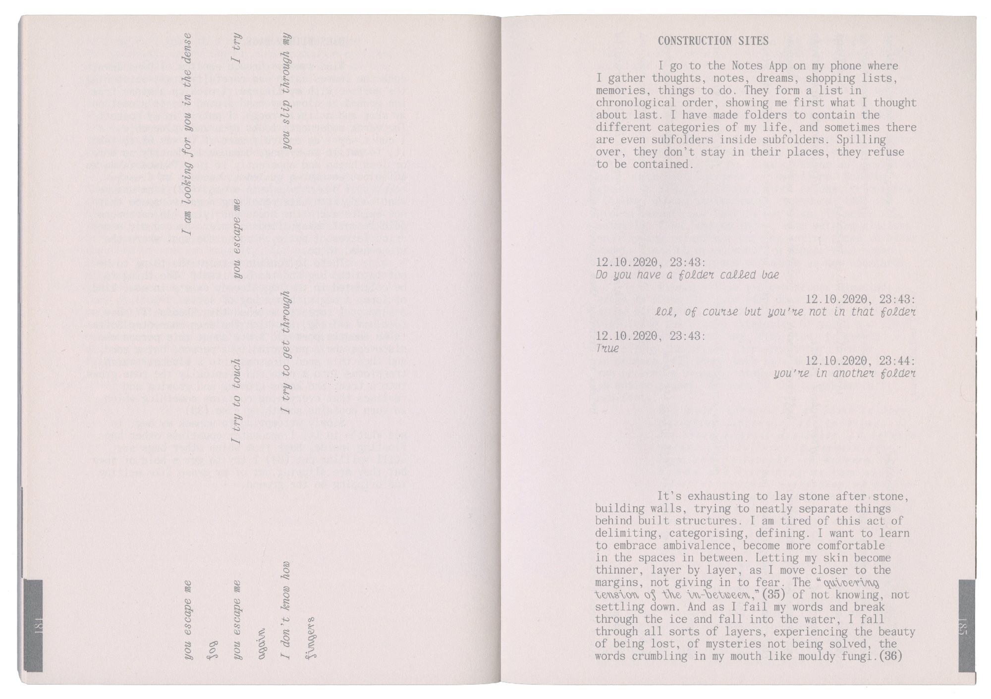 A book, among other things. They are results, or maybe stepping stones, of an experimental writing practice that revolves around the intuitive, the unknown and the non-permanent. Blurring the lines between writing and reading, thought and material, body and identity, they attempt to expand the meaning of text. Maybe, in this sense, writing can become a tender tool for knowledge production and internal reflection rather than a means for documentation.