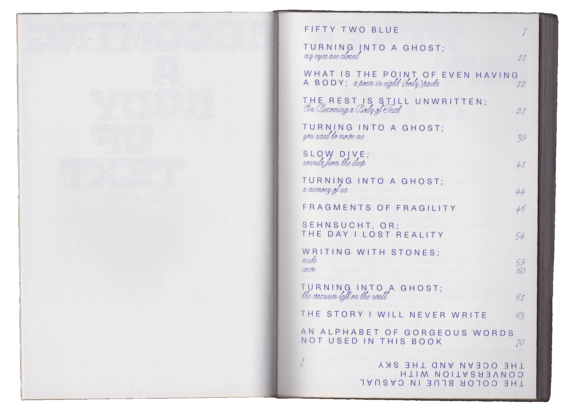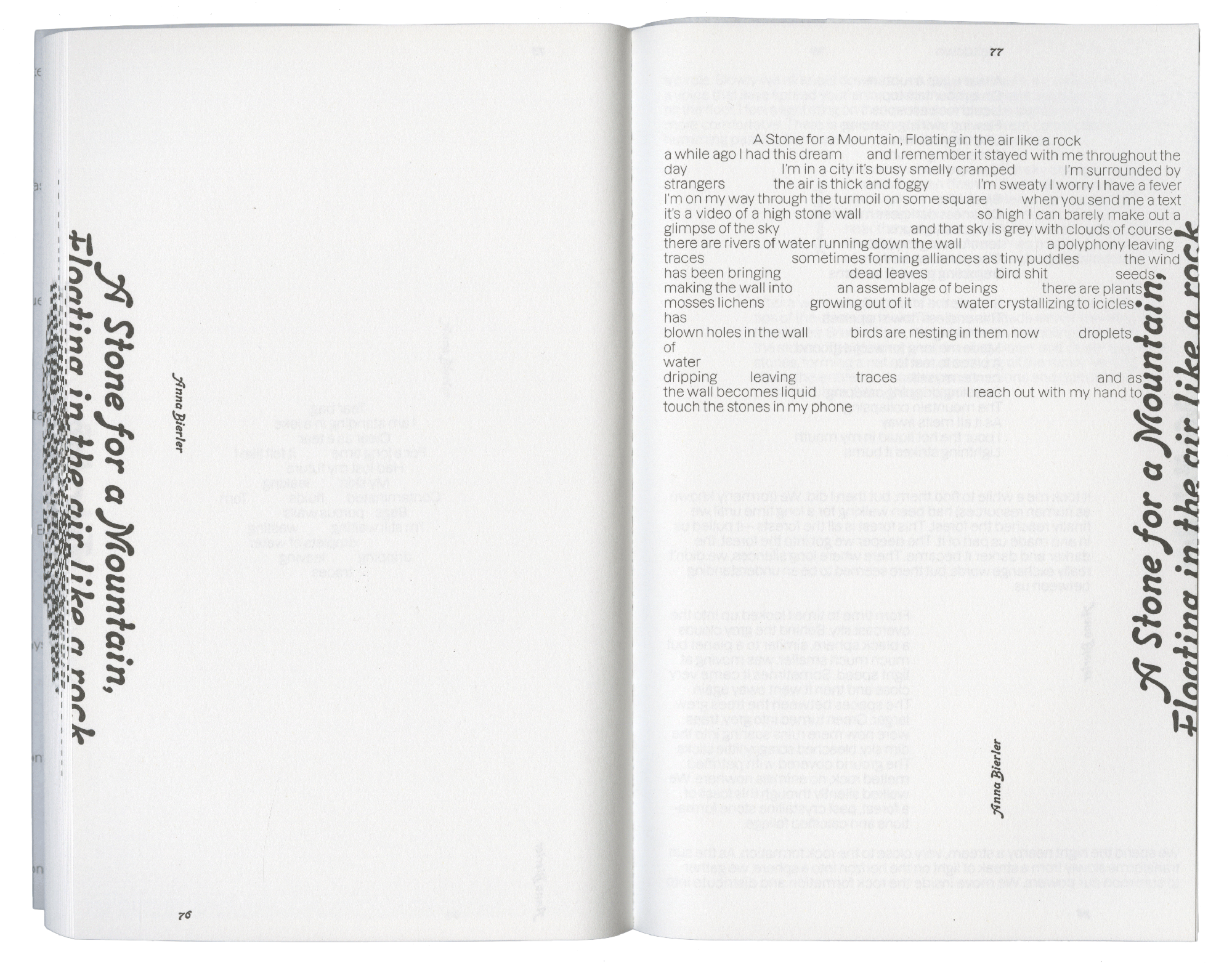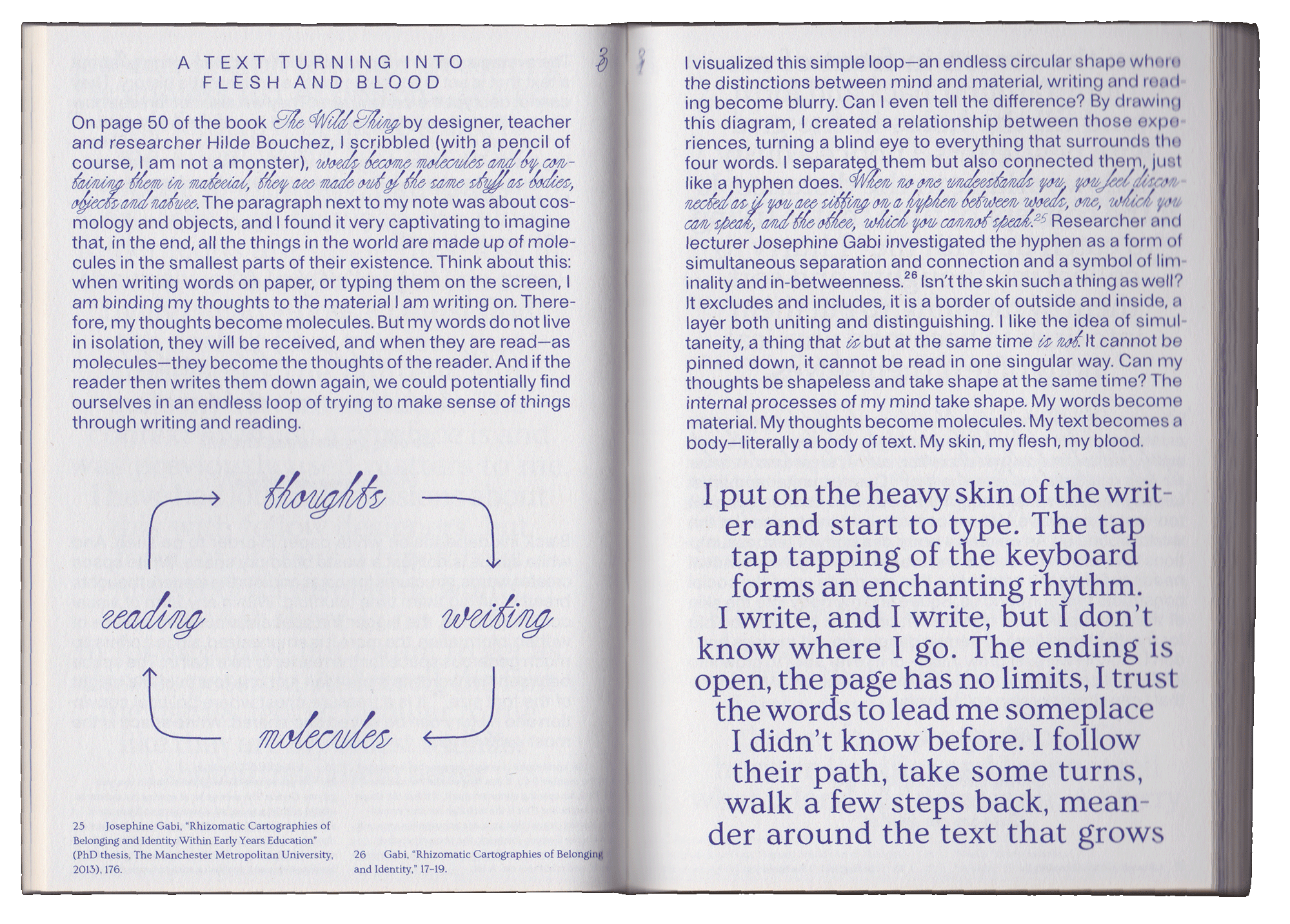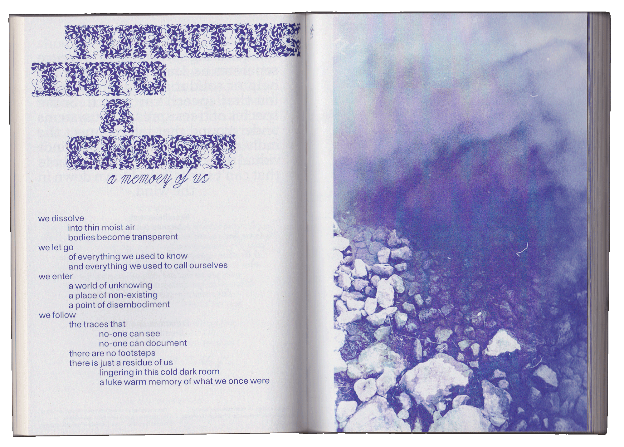 A book, among other things. They are results, or maybe stepping stones, of an experimental writing practice that revolves around the intuitive, the unknown and the non-permanent. Blurring the lines between writing and reading, thought and material, body and identity, they attempt to expand the meaning of text. Maybe, in this sense, writing can become a tender tool for knowledge production and internal reflection rather than a means for documentation.