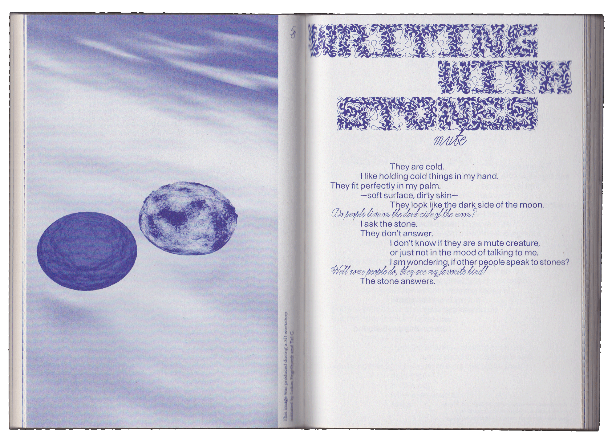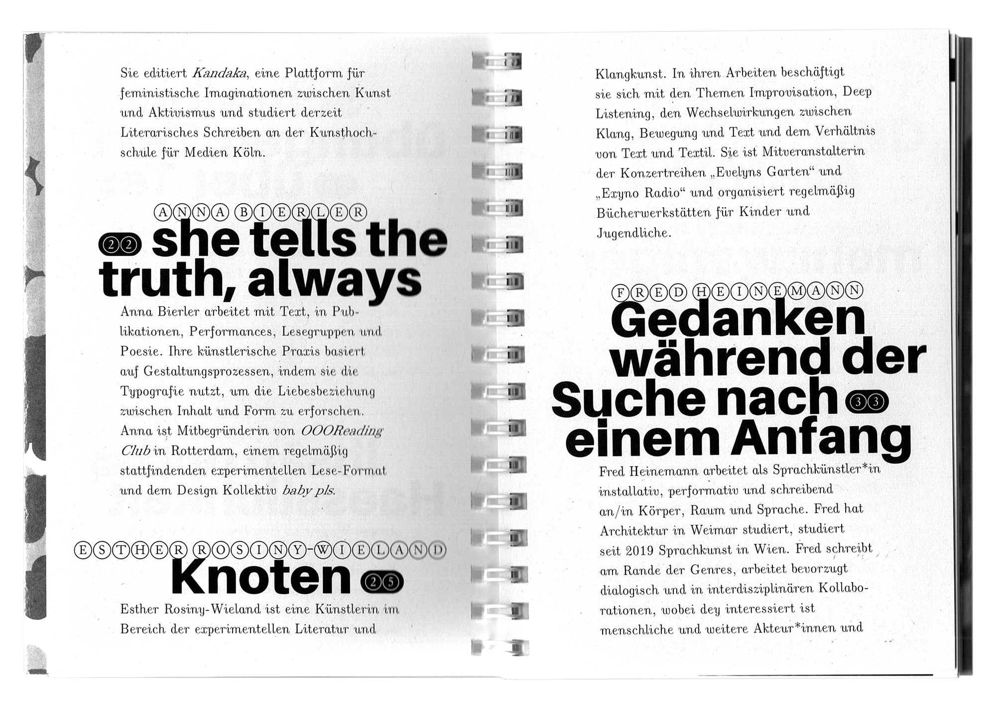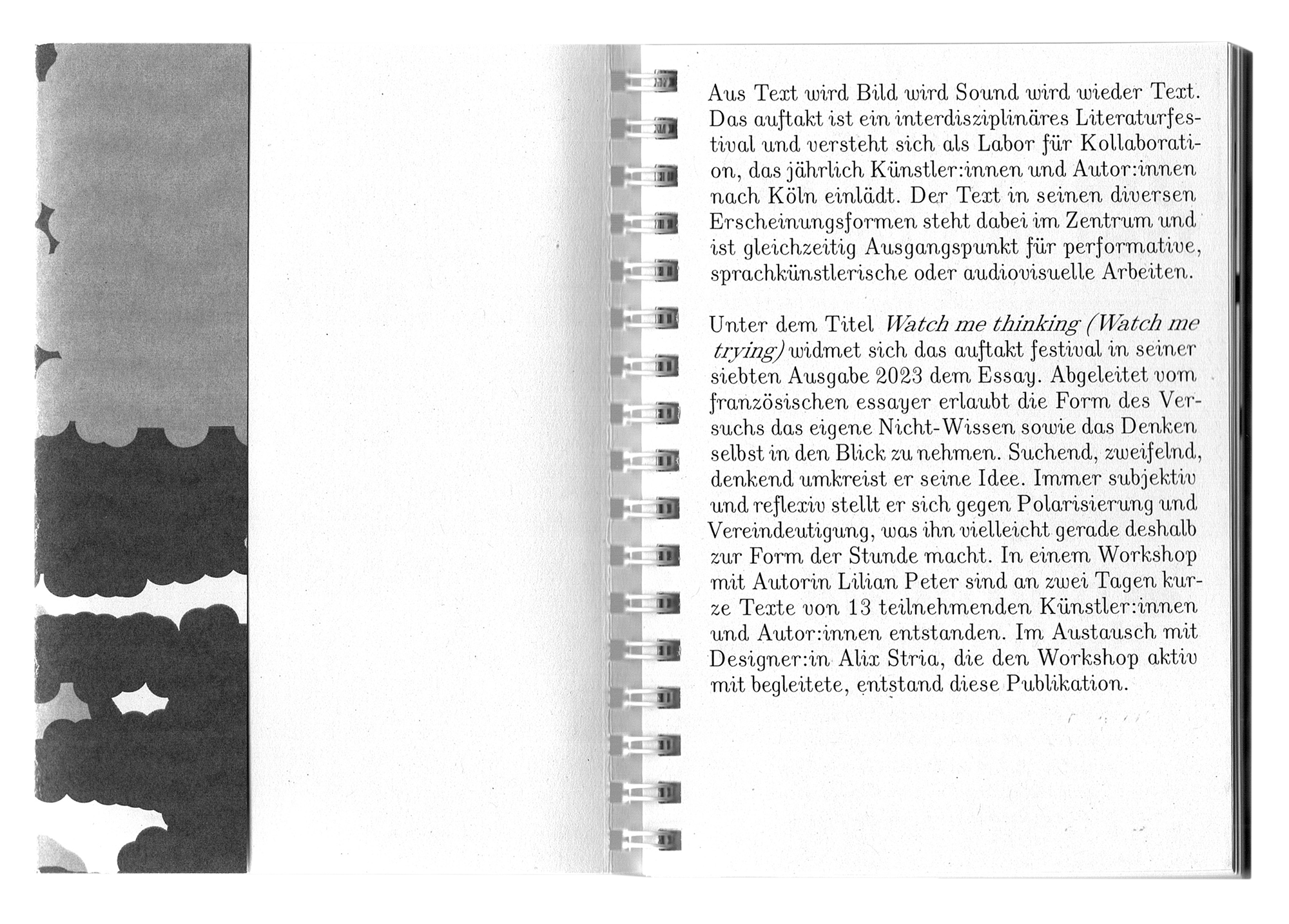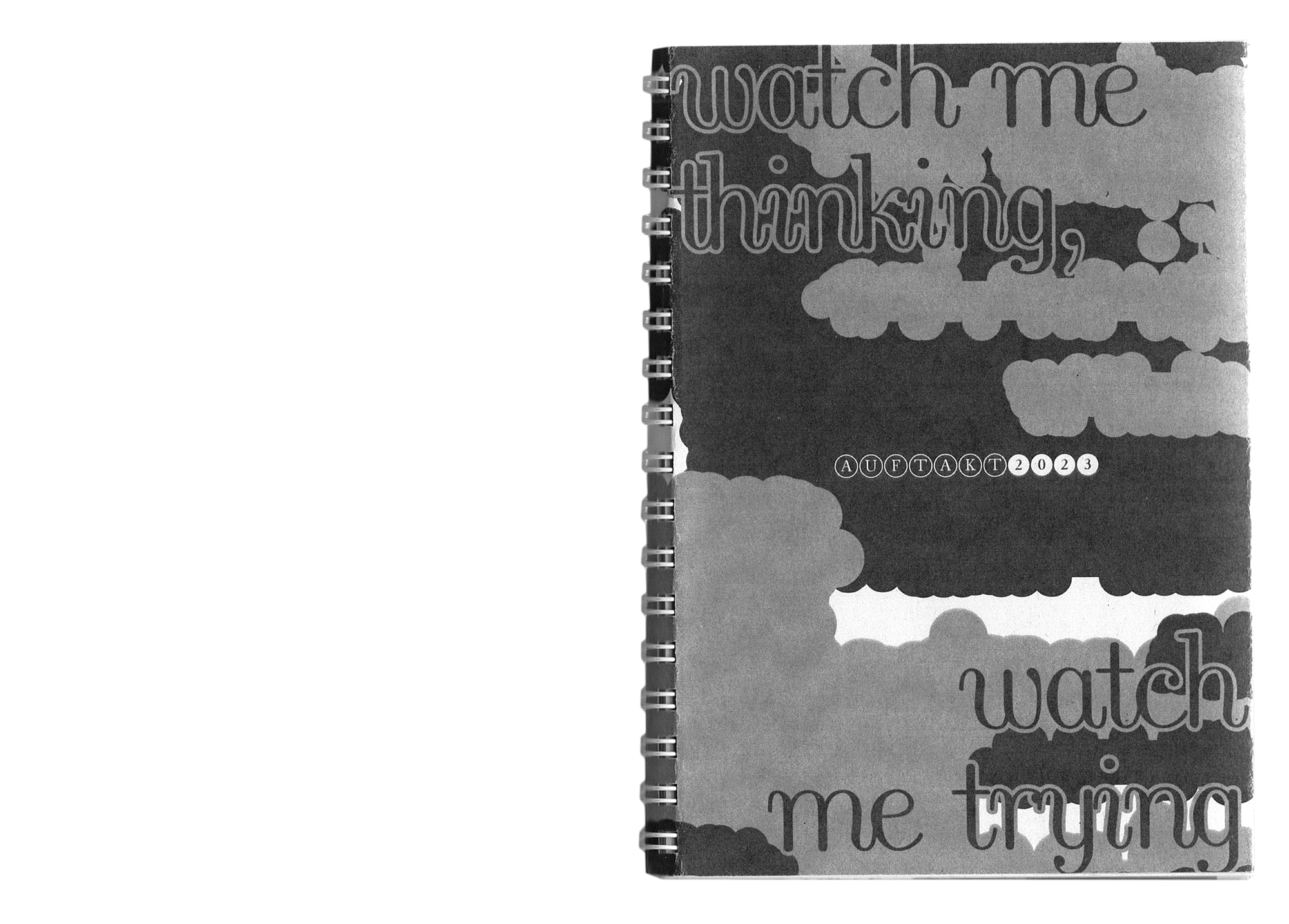 𝓌𝒶𝓉𝒸𝒽 𝓂𝑒 𝓉𝒽𝒾𝓃𝓀𝒾𝓃𝑔, 𝓌𝒶𝓉𝒸𝒽 𝓂𝑒 𝓉𝓇𝓎𝒾𝓃𝑔 is an instant publication for Auftakt Festival that came into existence in just a few days during a writing workshop led by Lilian Peter in frosty December 2023 in Cologne. In this publication typographic conventions were challenged – by slanting regular and un-slanting italic to take the other’s place – resulting in an unusual type treatment where italic turns regular and regular turns italic.