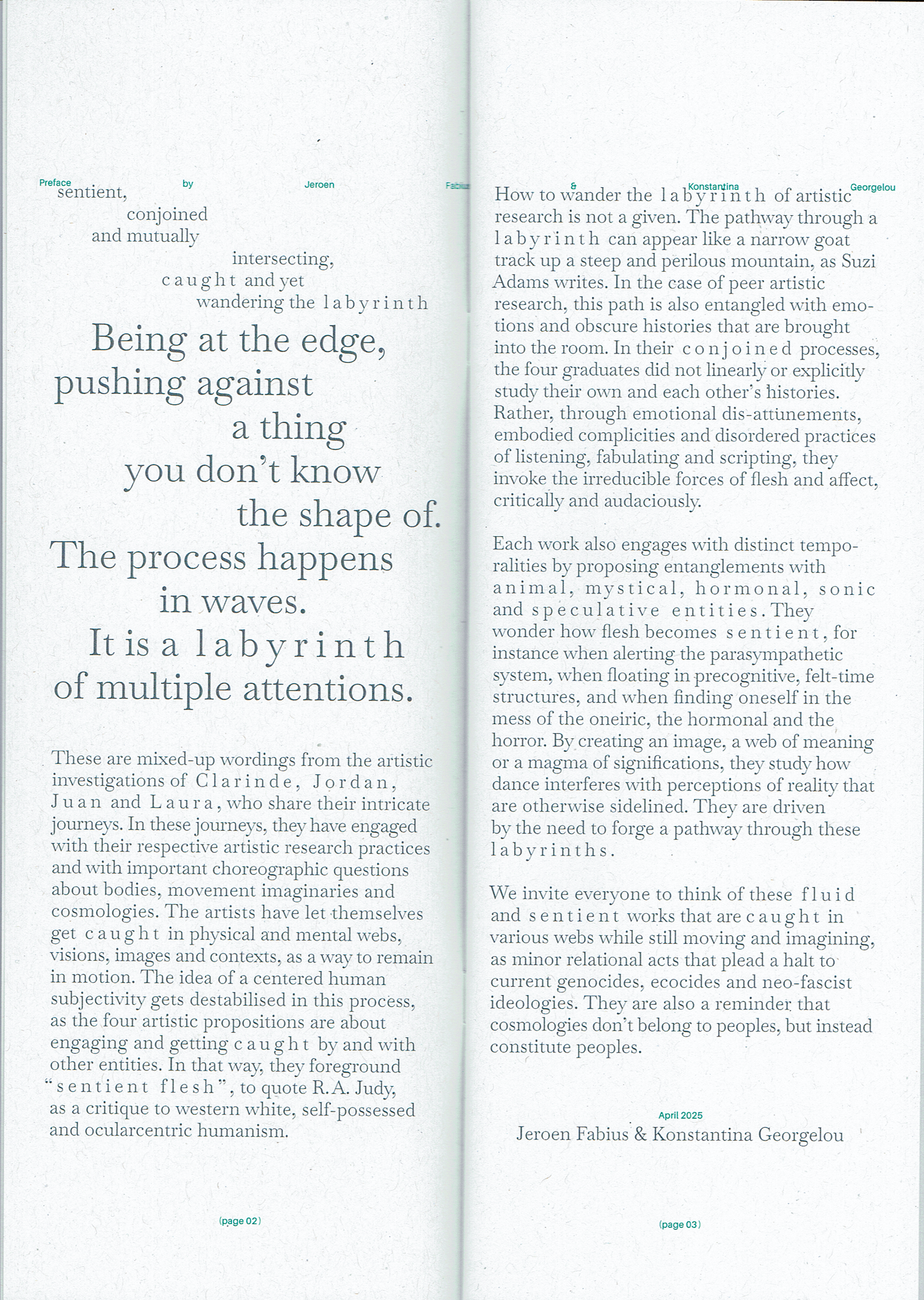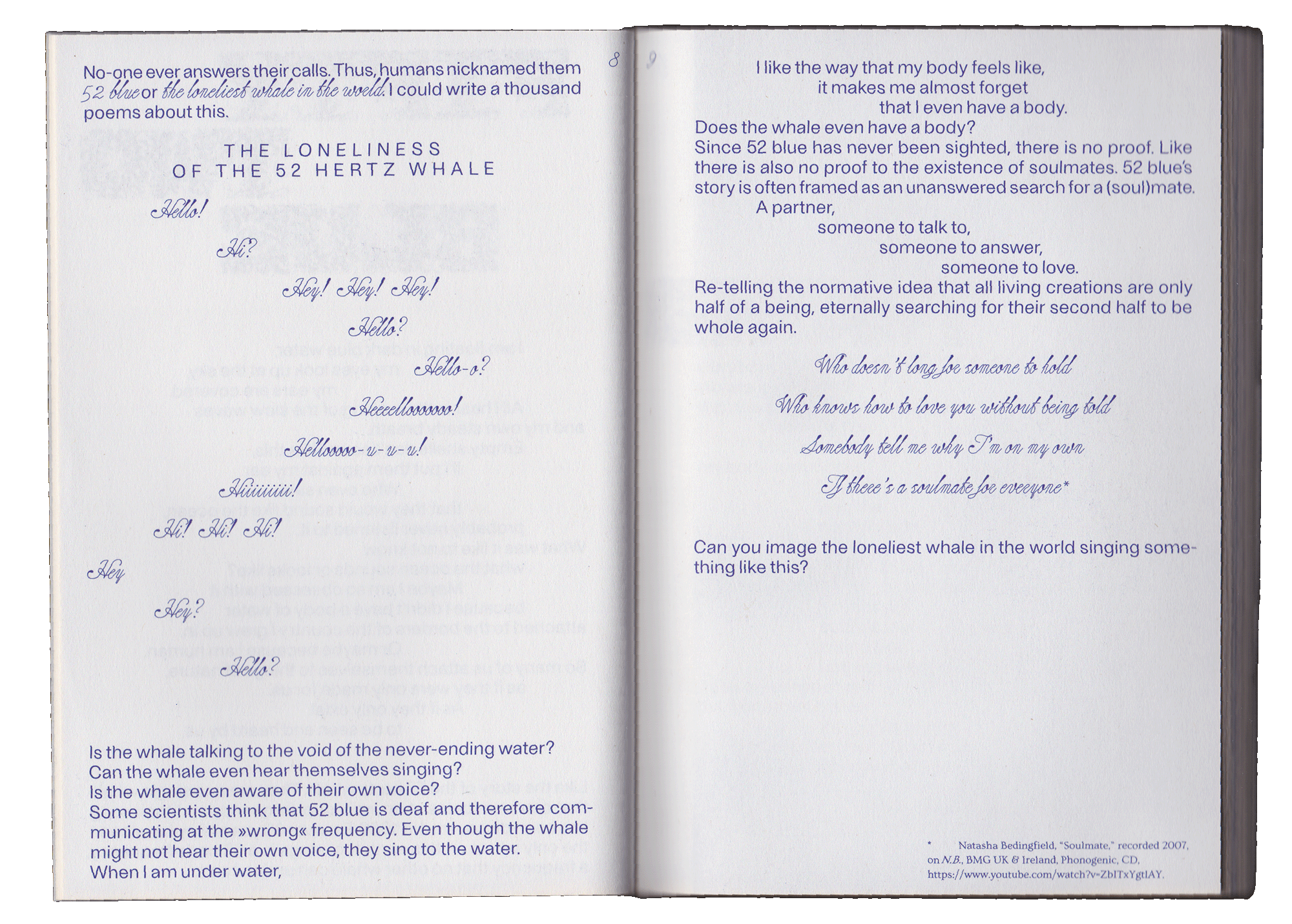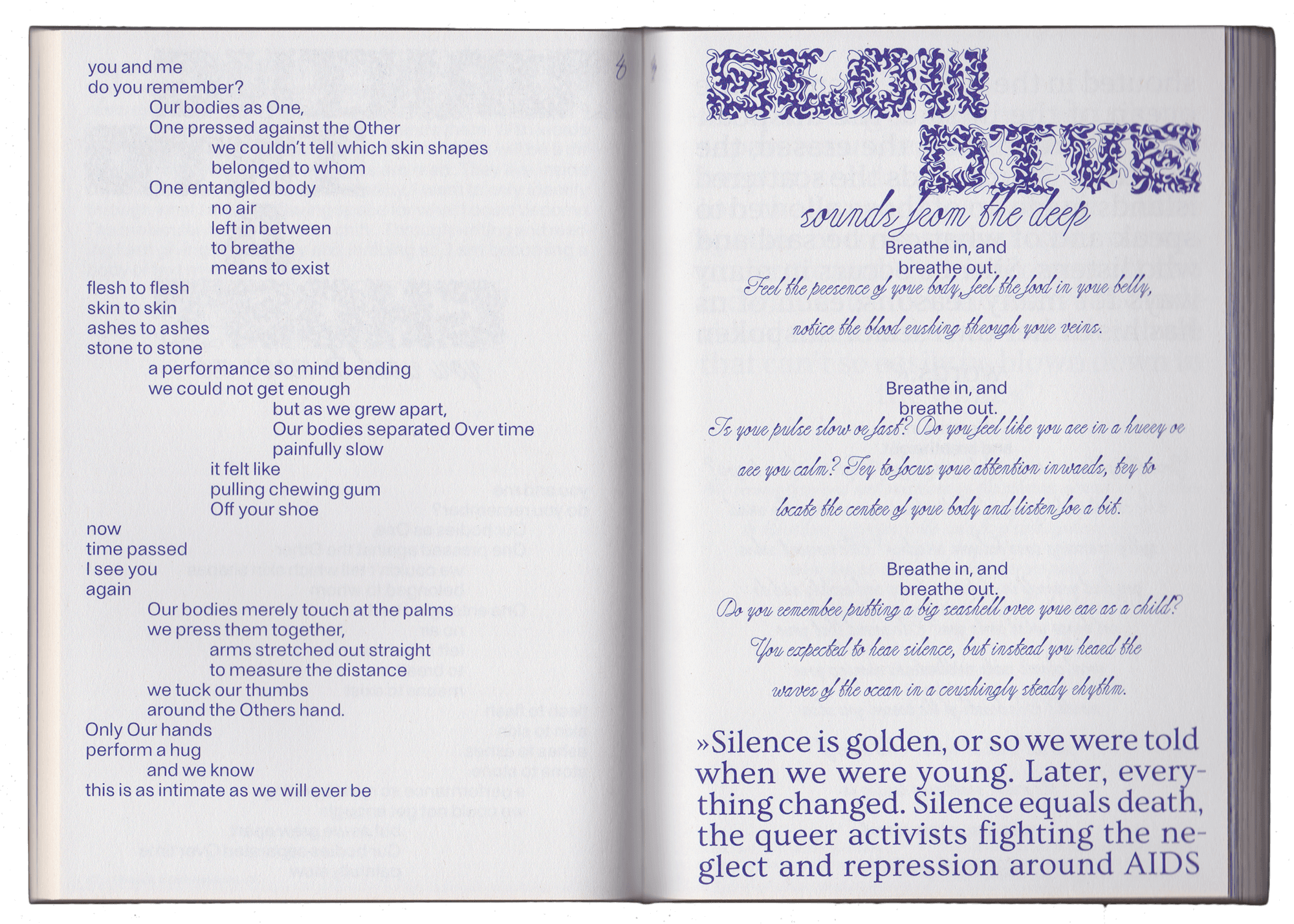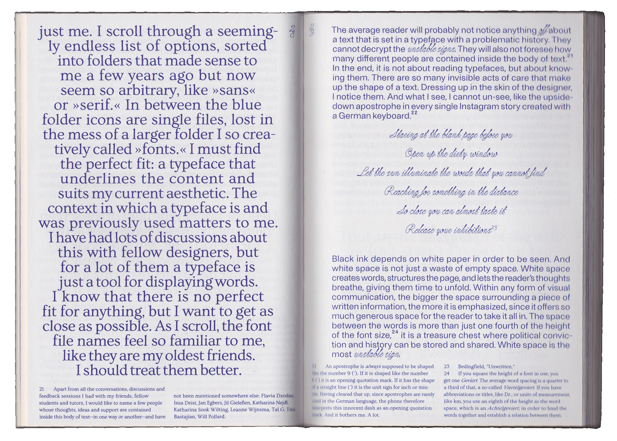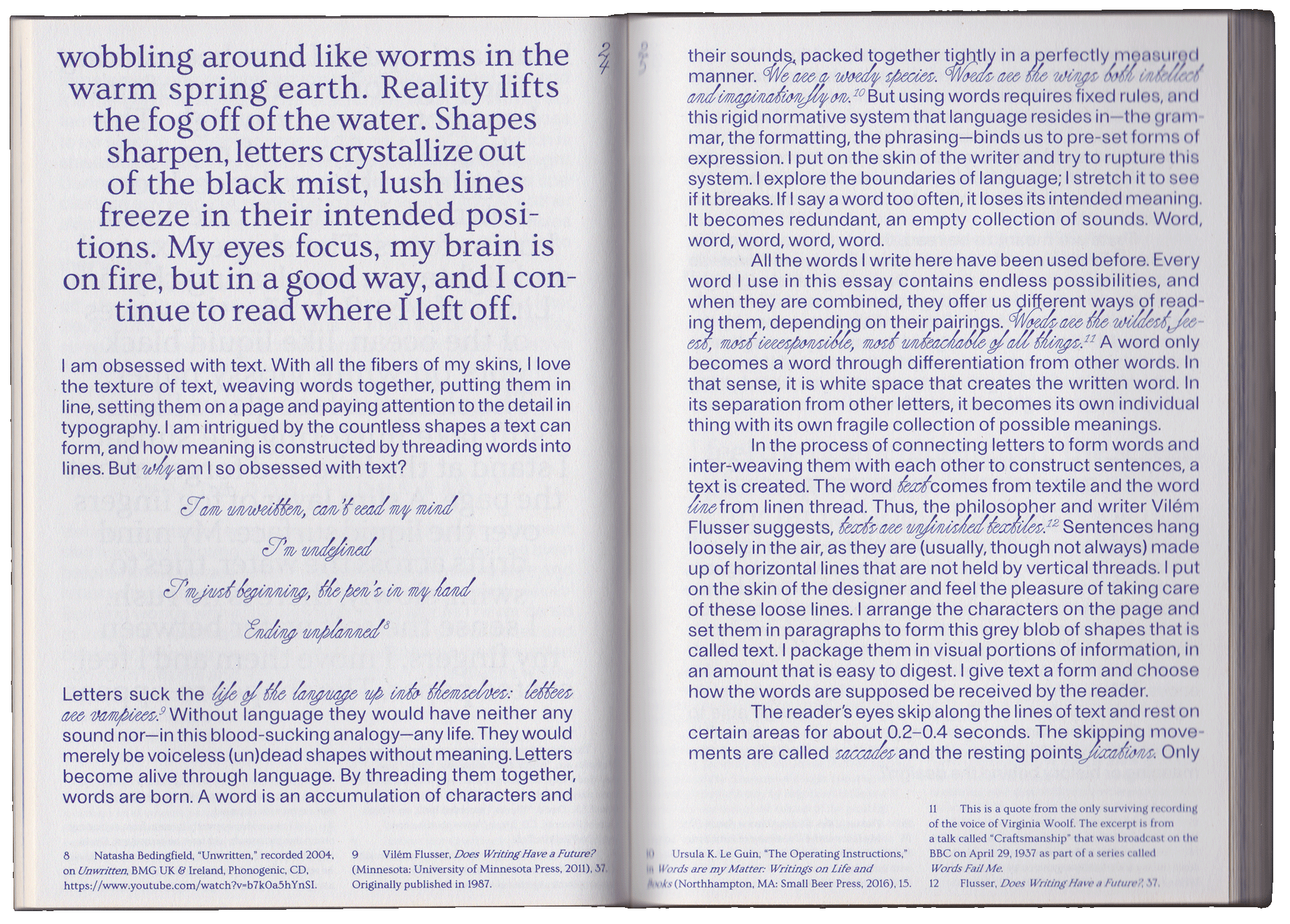 𝓌𝒶𝓉𝒸𝒽 𝓂𝑒 𝓉𝒽𝒾𝓃𝓀𝒾𝓃𝑔, 𝓌𝒶𝓉𝒸𝒽 𝓂𝑒 𝓉𝓇𝓎𝒾𝓃𝑔 is an instant publication for Auftakt Festival that came into existence in just a few days during a writing workshop led by Lilian Peter in frosty December 2023 in Cologne. In this publication typographic conventions were challenged – by slanting regular and un-slanting italic to take the other’s place – resulting in an unusual type treatment where italic turns regular and regular turns italic.