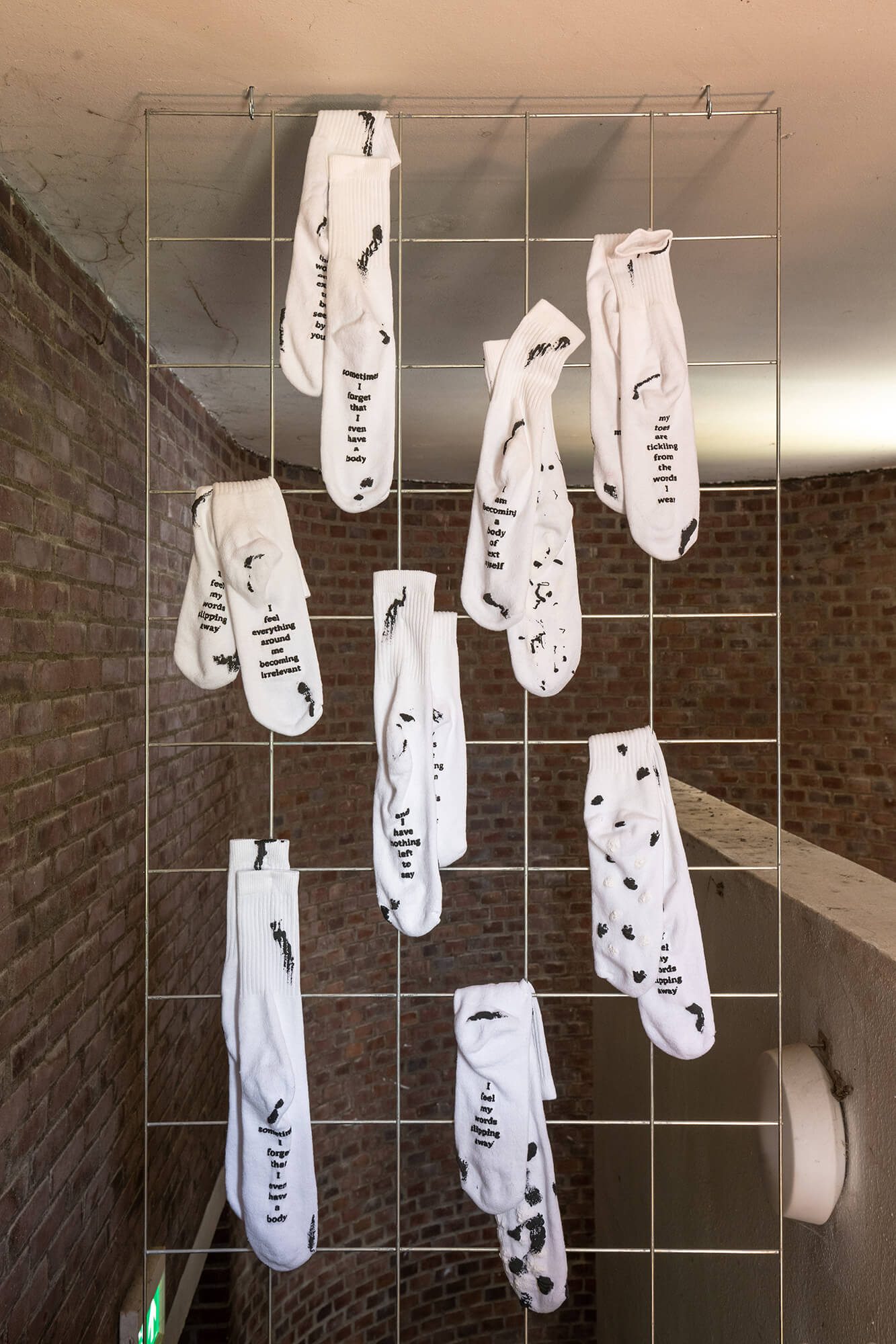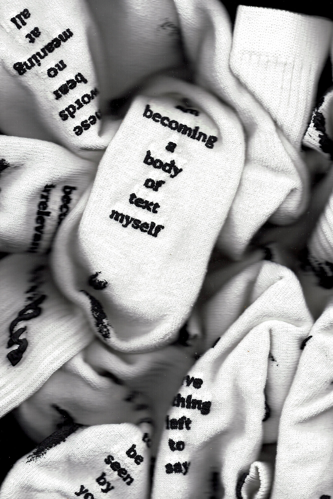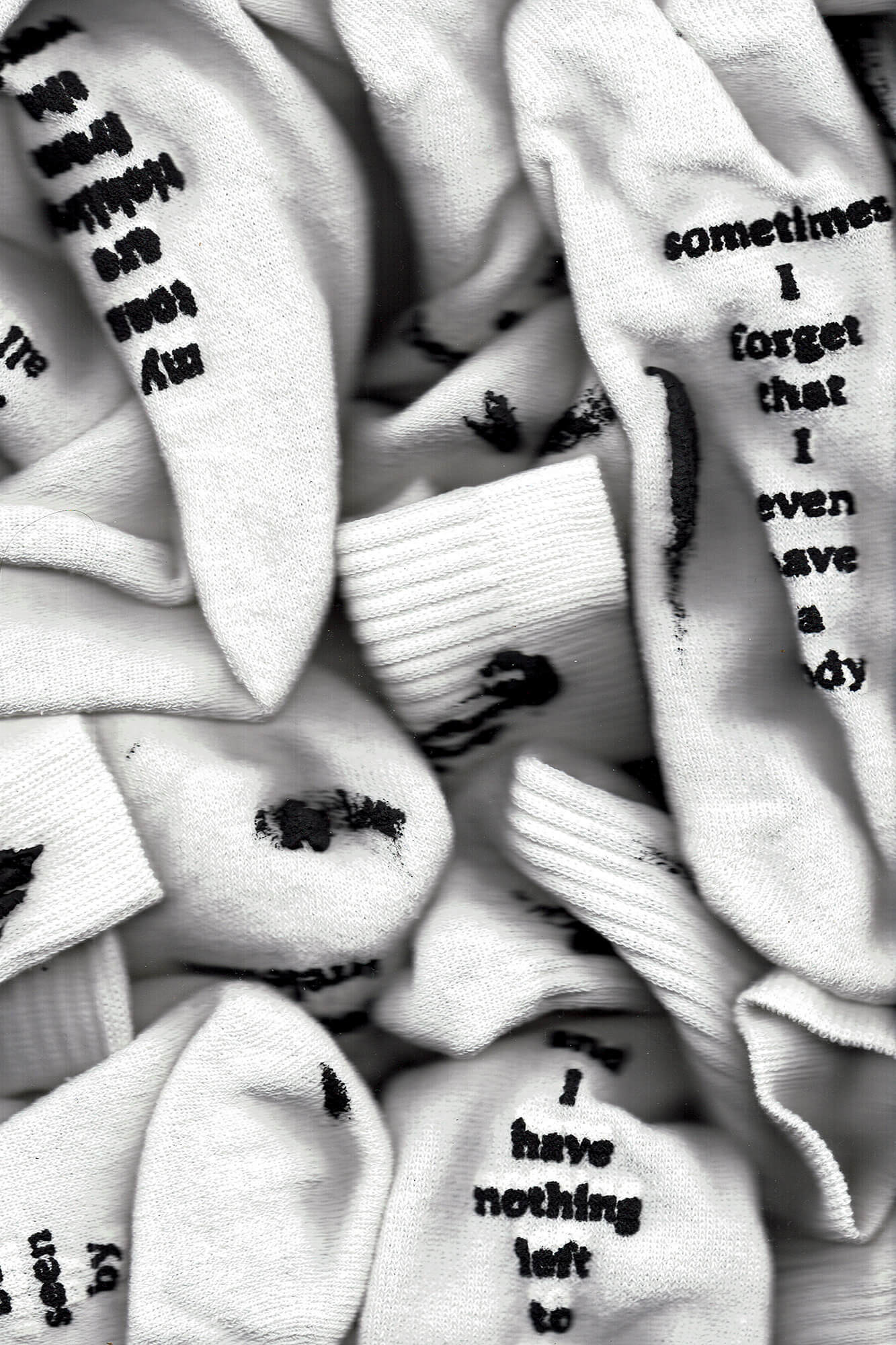 The soles of our feet are an intimate spot – grounding us while holding us. They are rarely public, covered by socks and tights and shoes. Here, fragile words are stored, born out of doubt, insecurity, vulnerability, frustration and anger, hidden away from peeking eyes, allowing to only be seen by those closest to us. Printed with anti-slip ink, the words carry the one who wears them without slipping away.