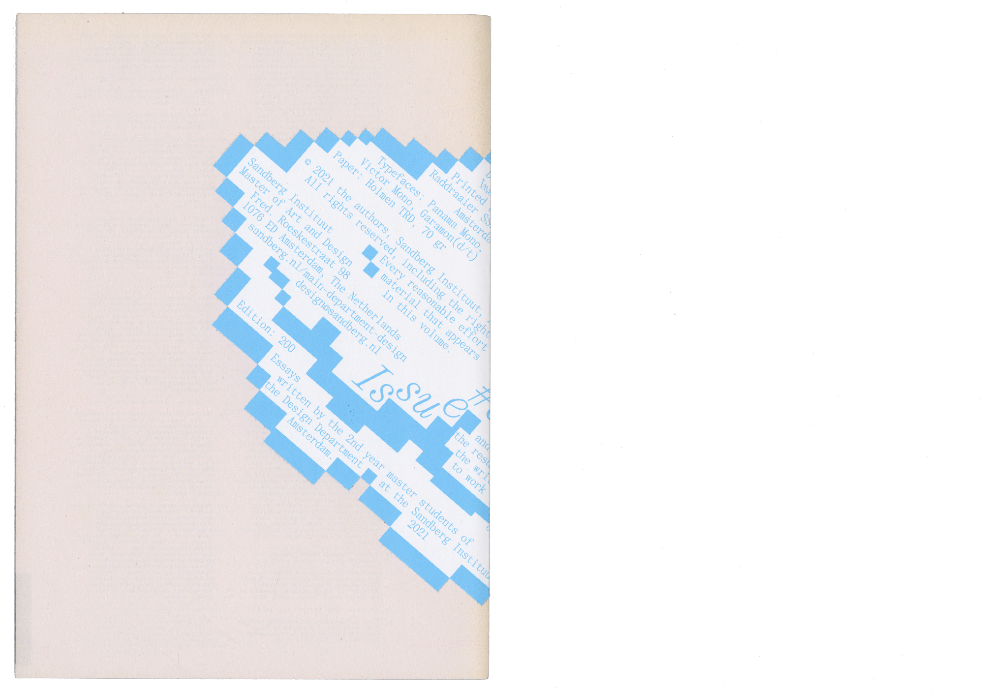 Following a 12pt grid the layout unfolds on the page in multiplicities, allowing for an individual treatment of text and its content. The Issue is an annual printed publication, self-published by the @sandbergdesigndepartment that contains essays written by 2nd year students.