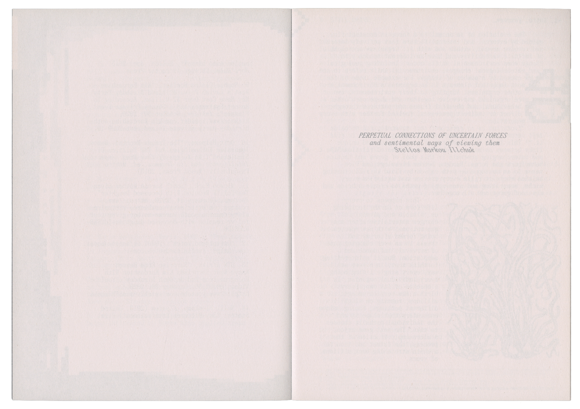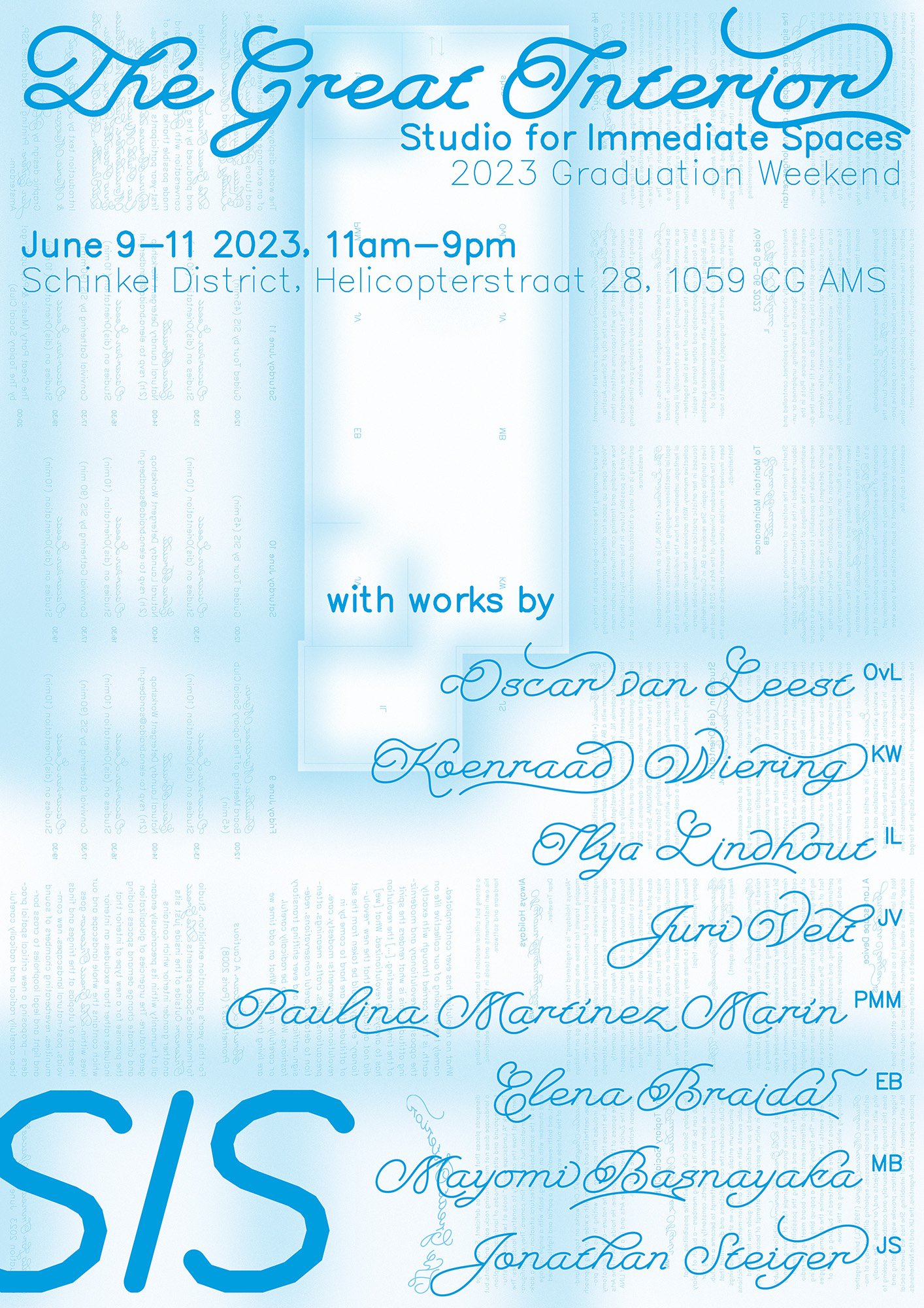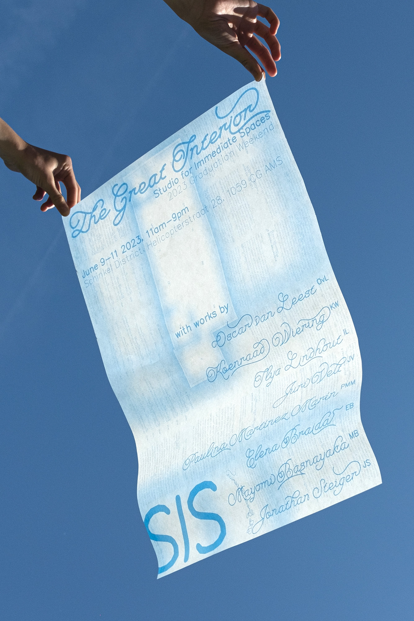 The graduation show of Studio For Immediate Spaces, The Great Interior, went in search of “a new type of interior that includes rather than excludes; an interior which contains the whole landscape and our lives within.” In the same way, the translucent exhibition guide opens the division between inside and outside. Typographically, it makes use of skeleton letterforms that have no determined volume but can expand at will.