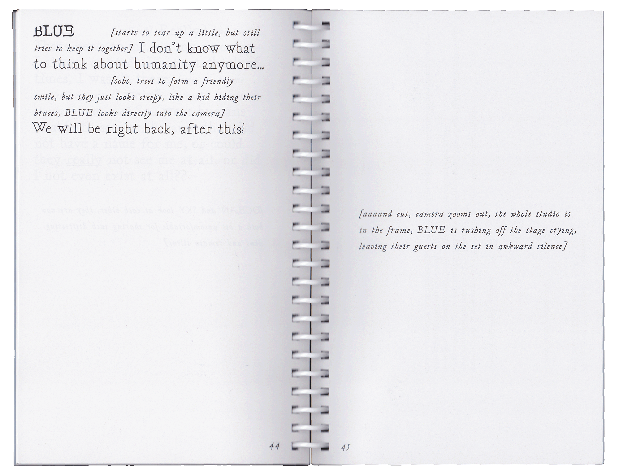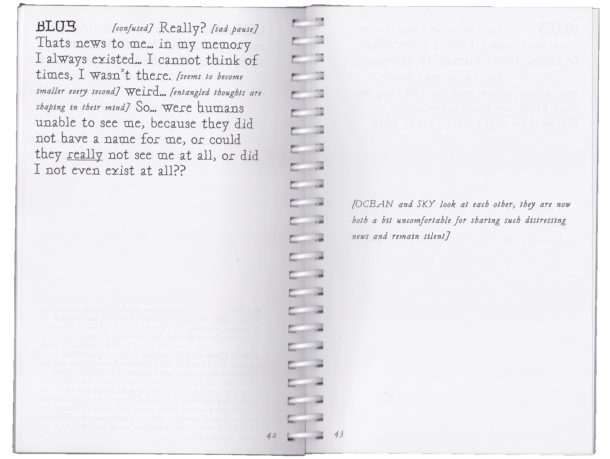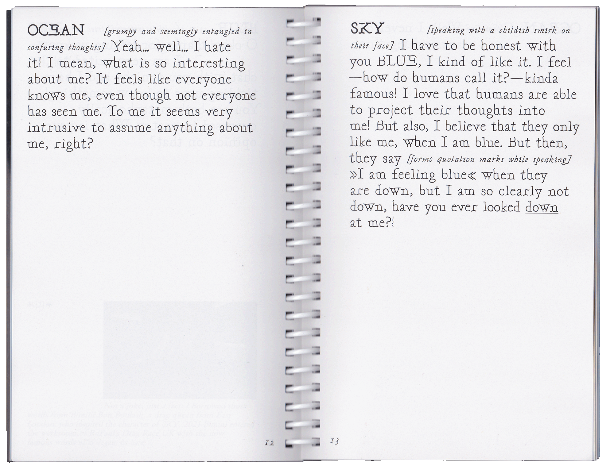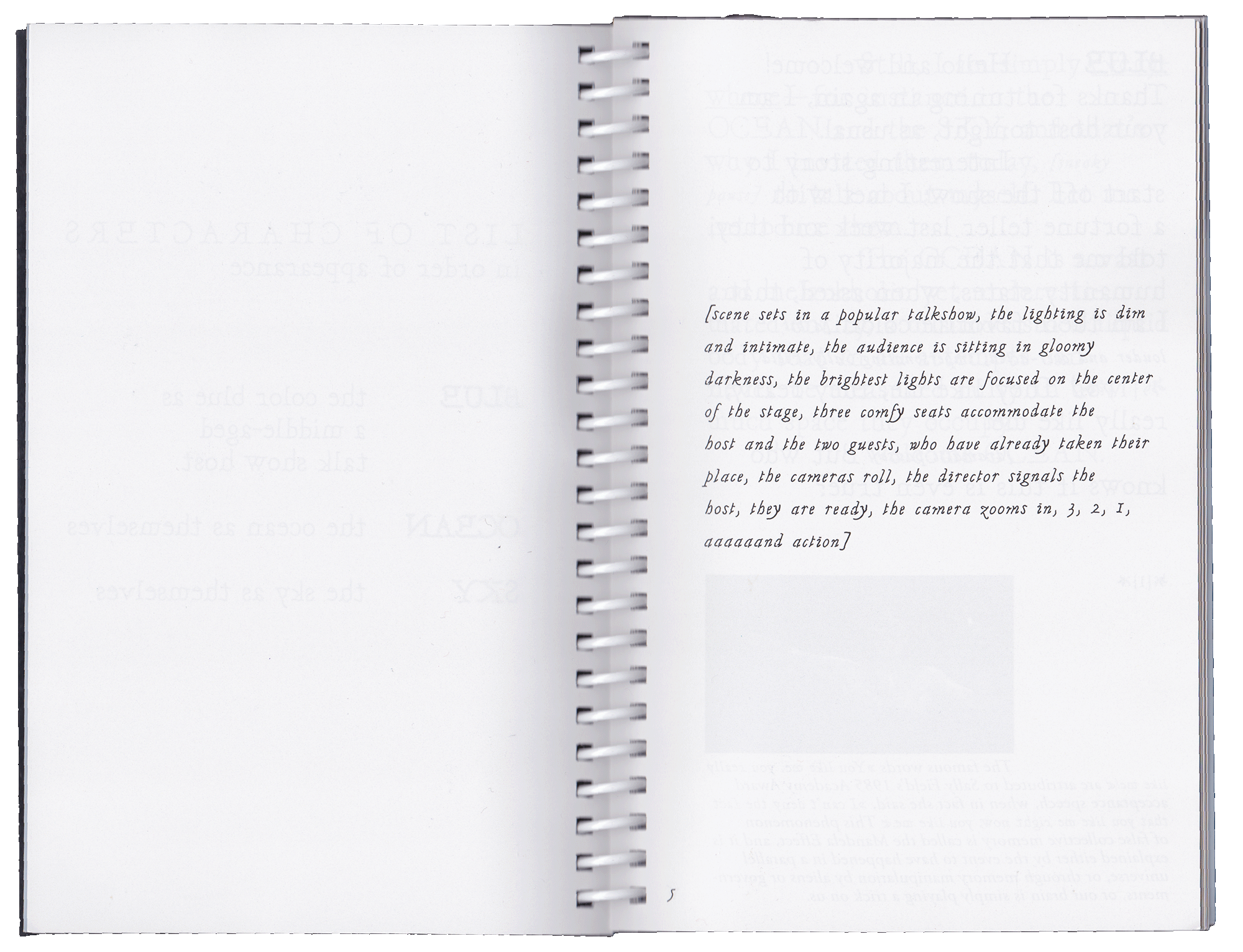The script The color BLUE in casual conversation with the OCEAN and the SKY is set in a talkshow, where the three guests speak about poetry, metaphors and the meaning of life. Being metaphors themselves, they question their origins, their names and their existence. The script is filled with pop culture references and uncommon connections, where in the end, one is left asking themselves »If I don’t have a name, do I even exist?«