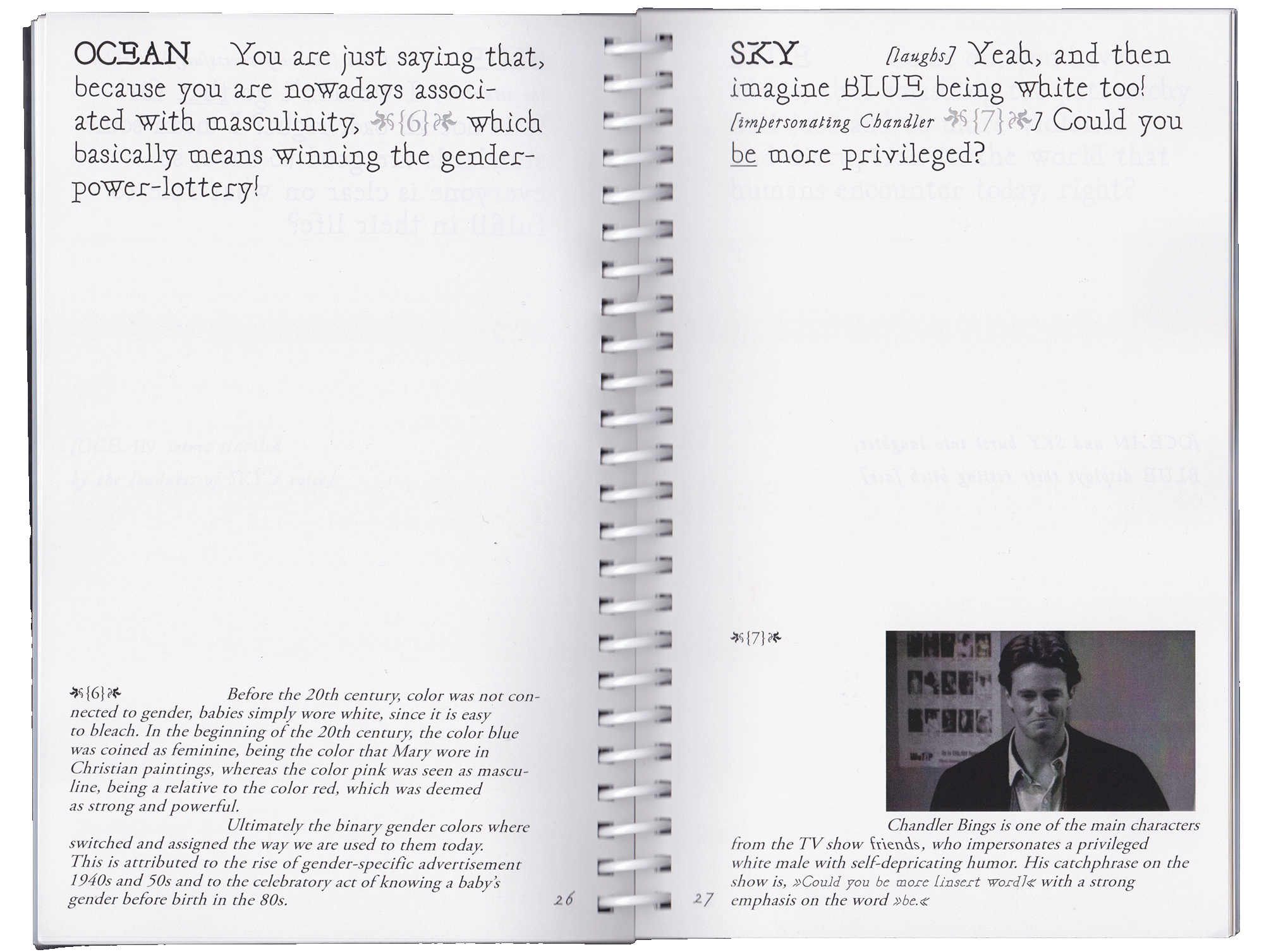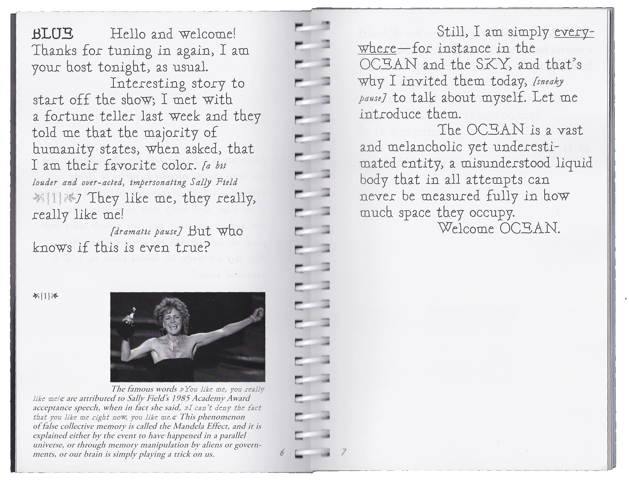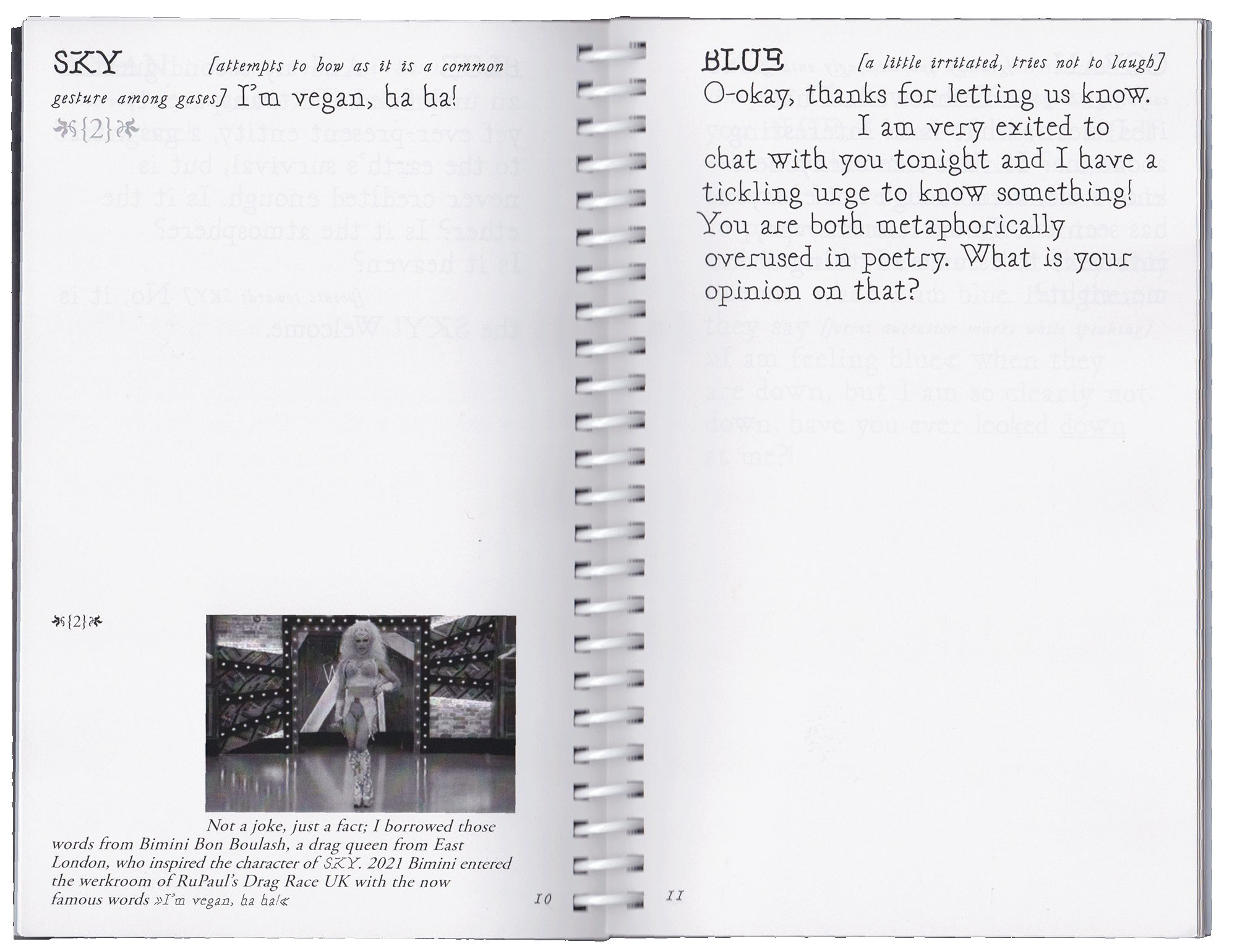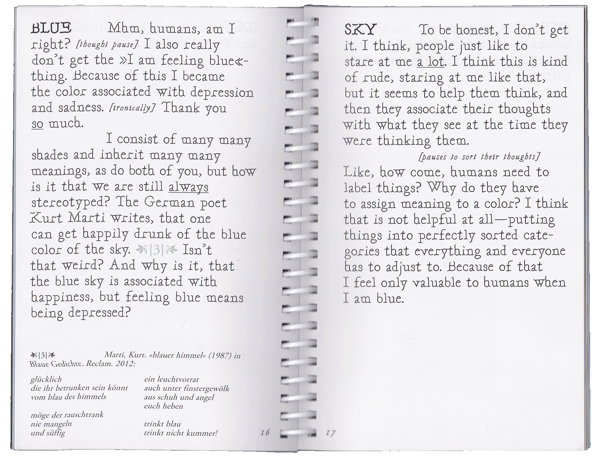 The script The color BLUE in casual conversation with the OCEAN and the SKY is set in a talkshow, where the three guests speak about poetry, metaphors and the meaning of life. Being metaphors themselves, they question their origins, their names and their existence. The script is filled with pop culture references and uncommon connections, where in the end, one is left asking themselves »If I don’t have a name, do I even exist?«