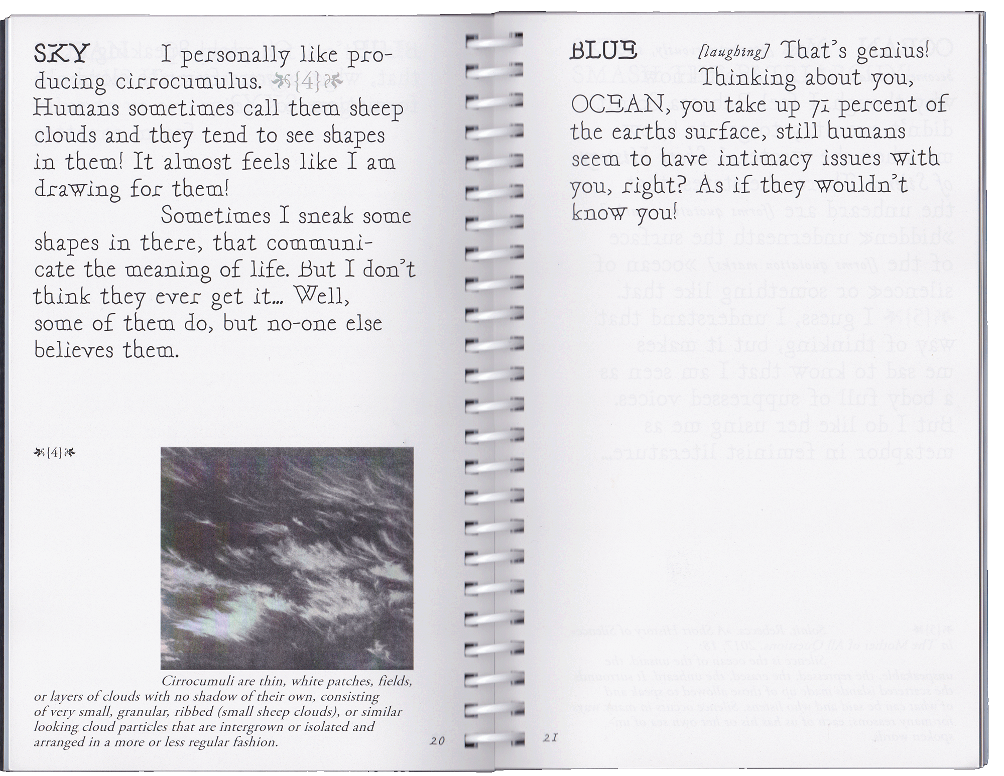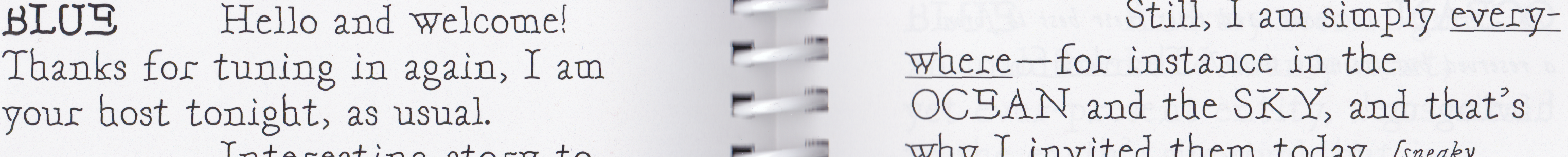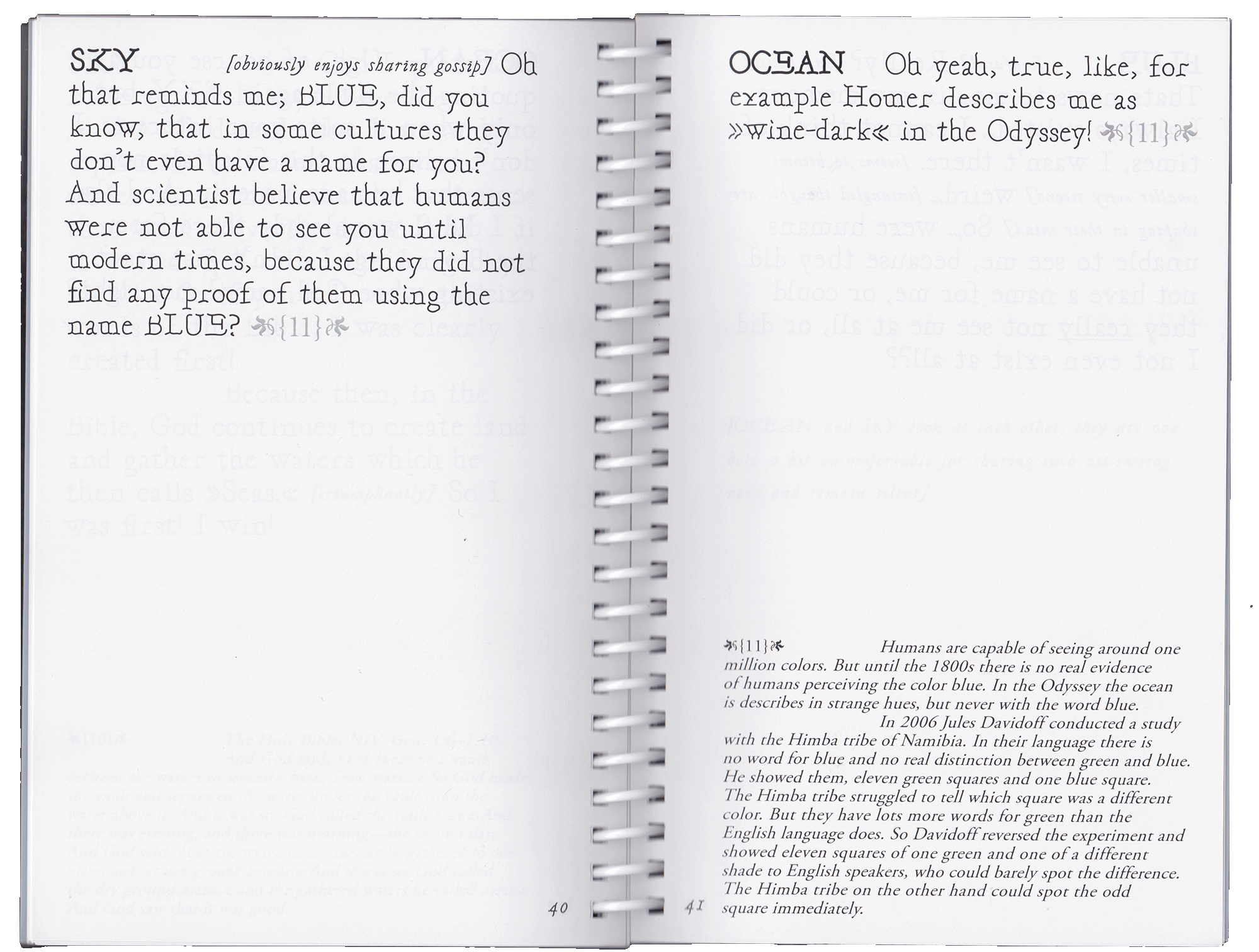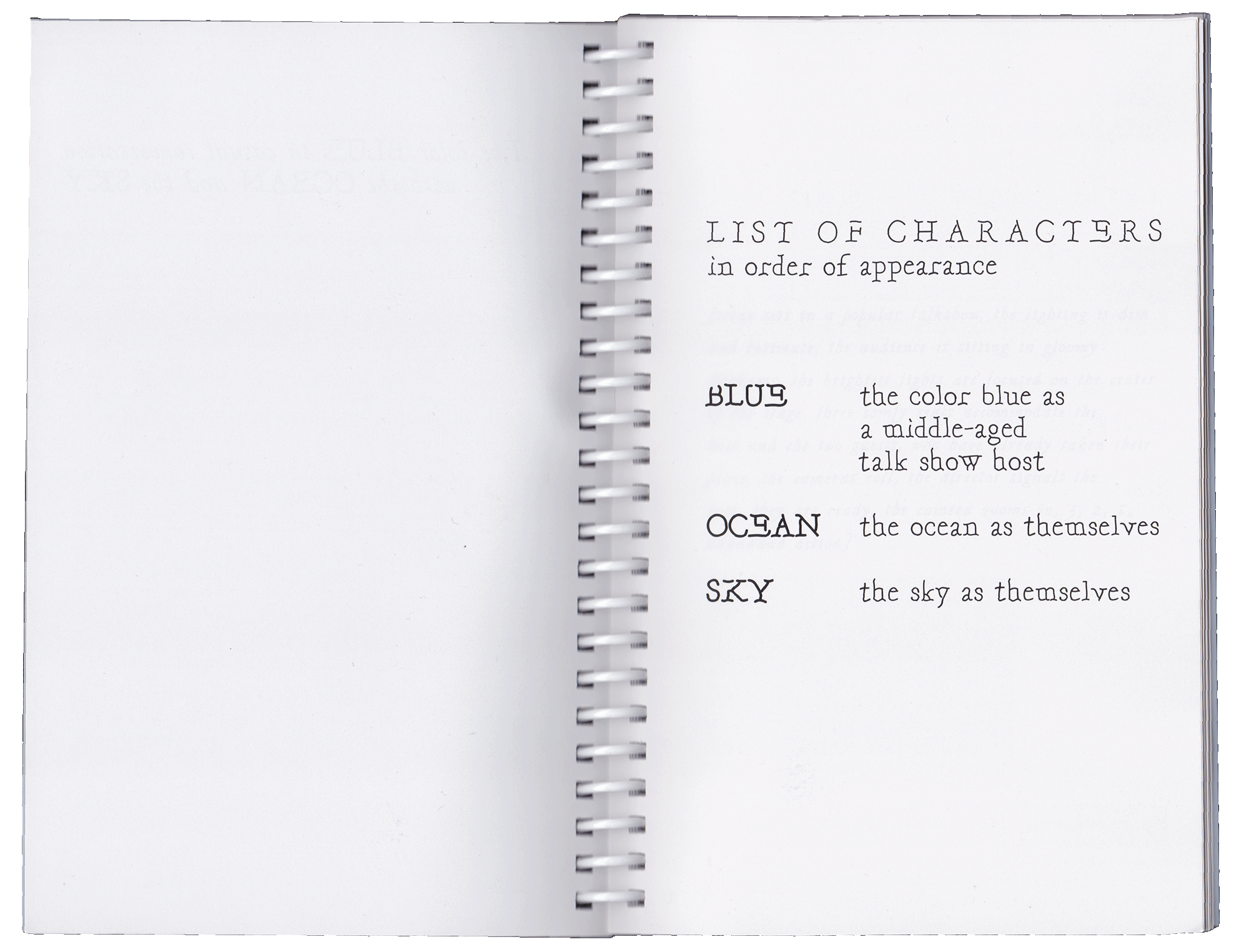 The script The color BLUE in casual conversation with the OCEAN and the SKY is set in a talkshow, where the three guests speak about poetry, metaphors and the meaning of life. Being metaphors themselves, they question their origins, their names and their existence. The script is filled with pop culture references and uncommon connections, where in the end, one is left asking themselves »If I don’t have a name, do I even exist?«