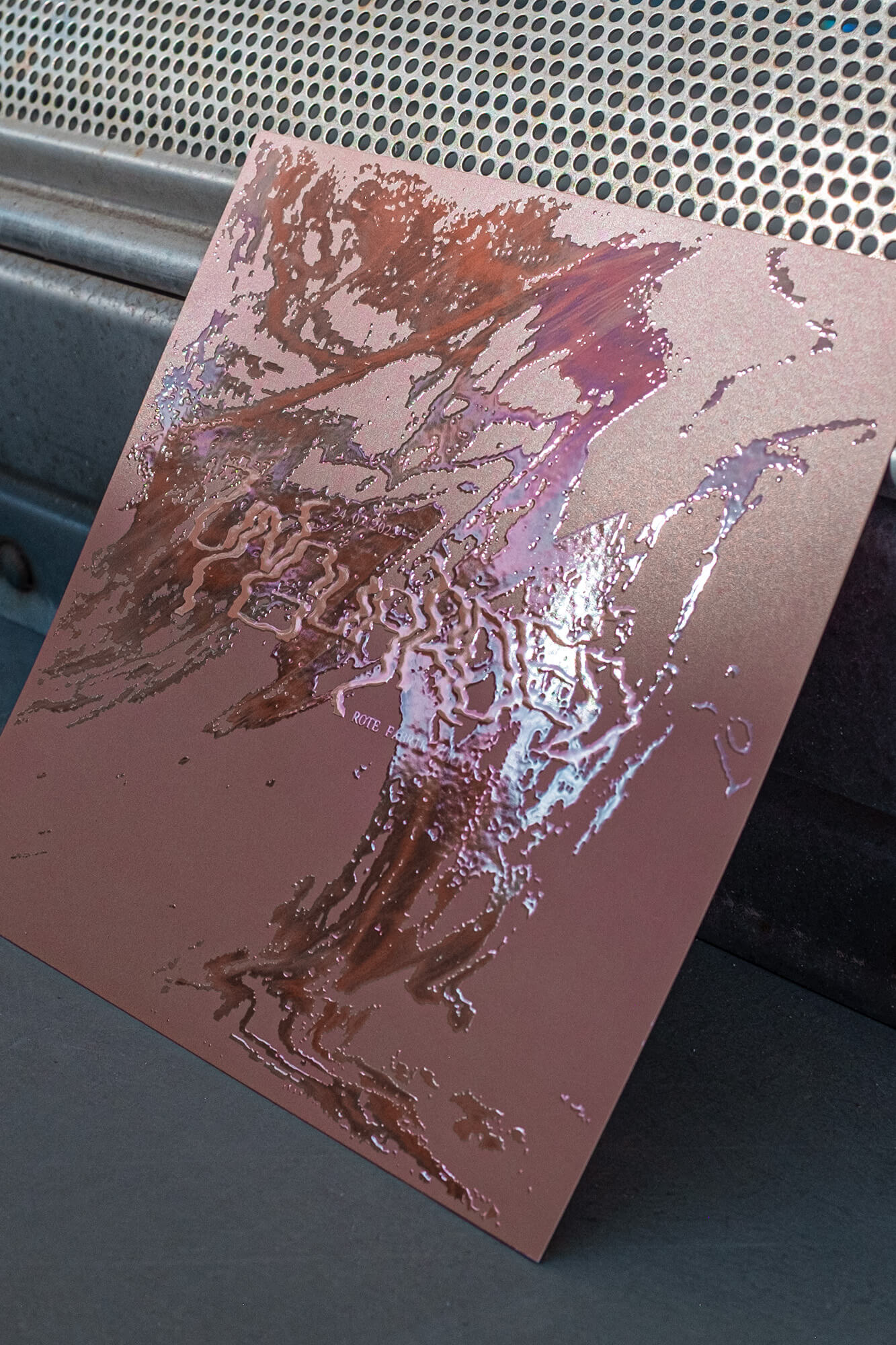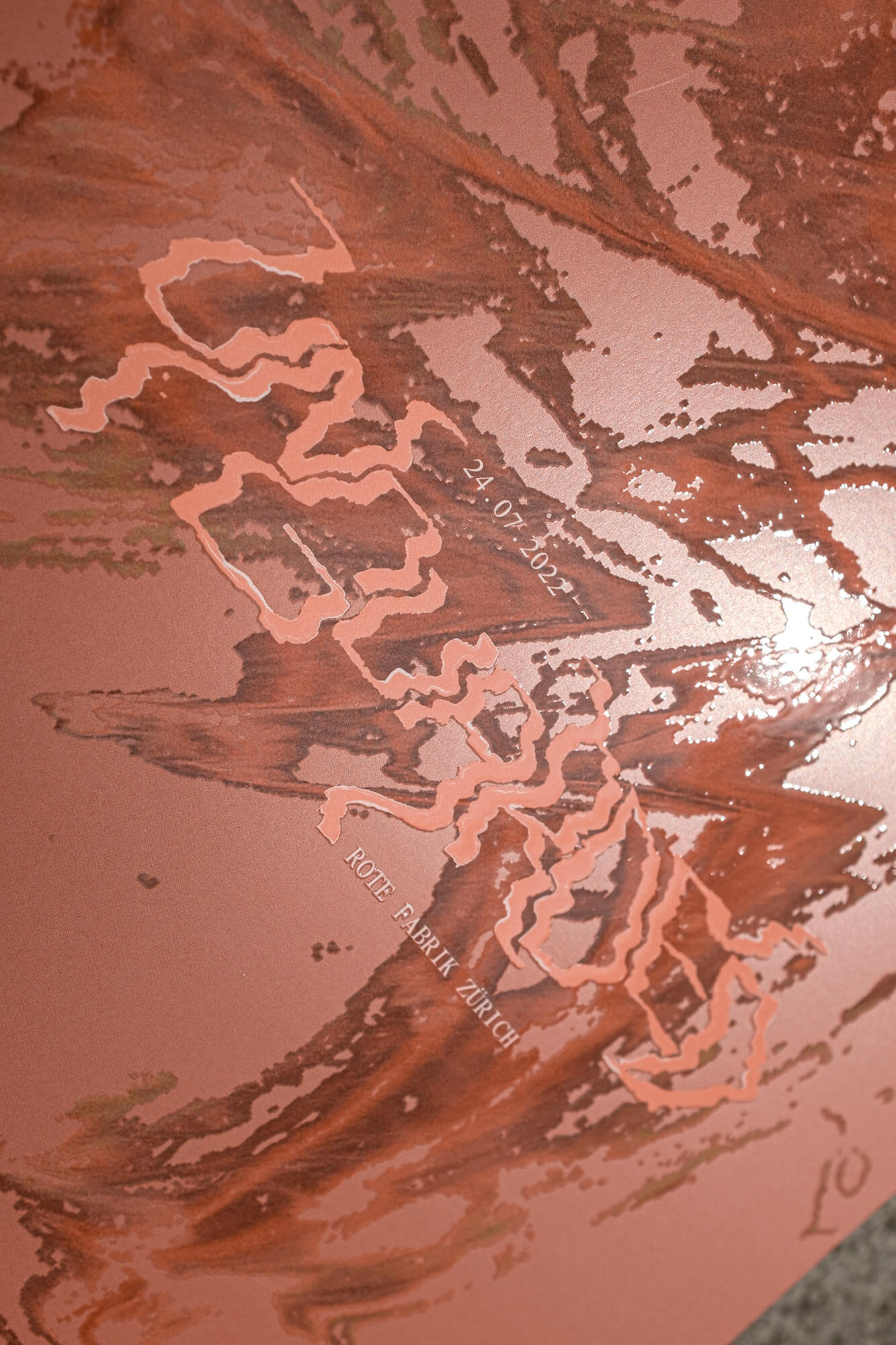 An invitation in the size of a vinyl cover, refined with relief varnish, for the unguarded label night at Rote Fabrik Zürich.